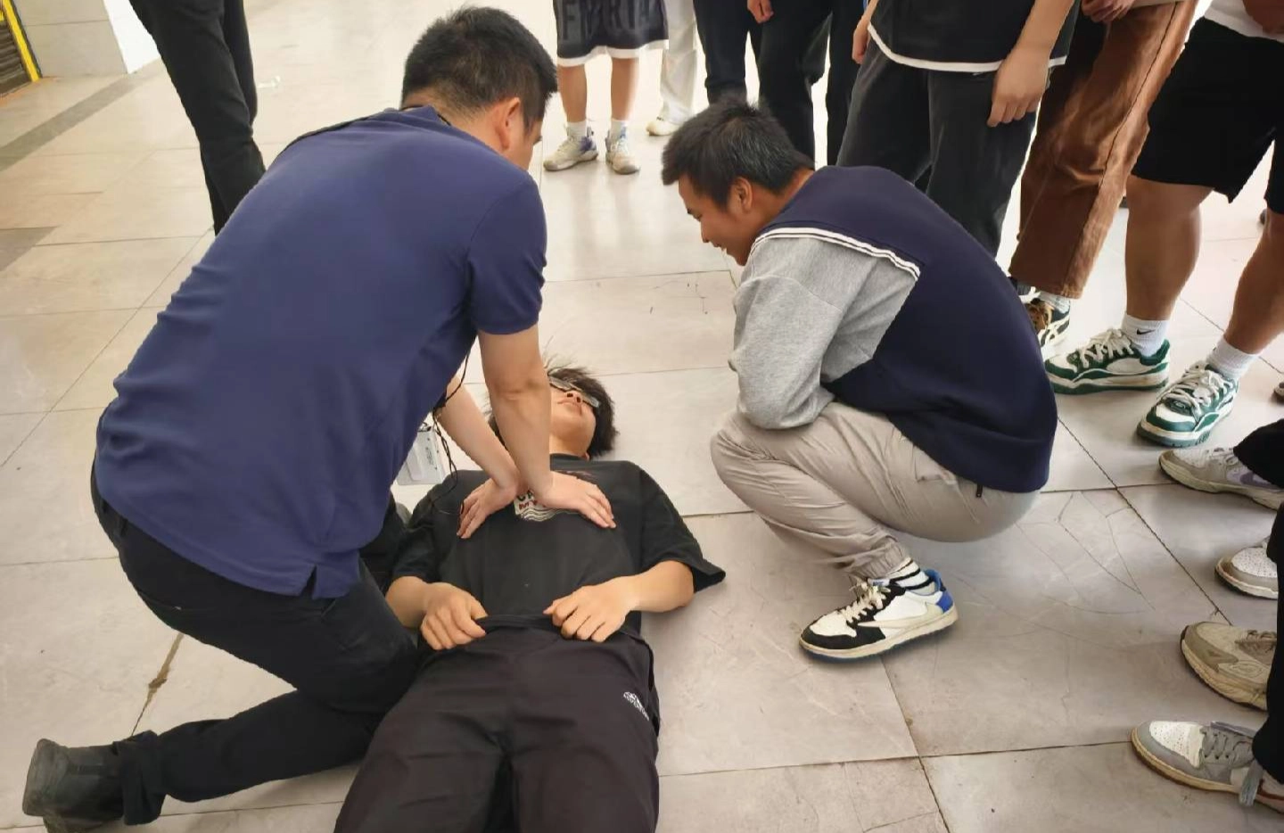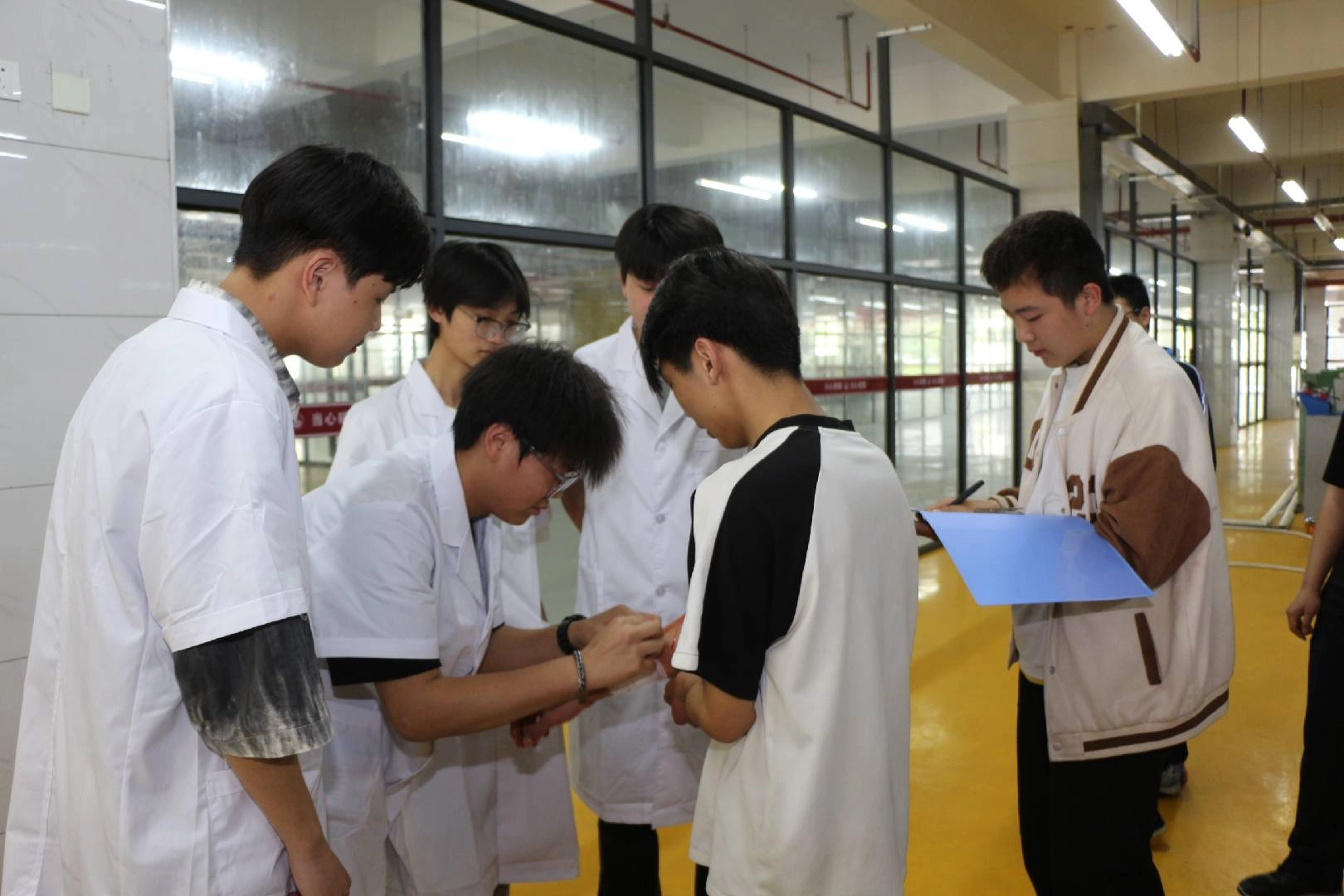 上海交大教育集团殷可欣老师在机加工实训室组织了邵东创新职校高一四个校企合作班级参与此次演练。针对不同的受伤部位,同学们开展了细致入微的角色扮演。他们巧妙运用准备好的道具材料,对“受伤部位”进行认真包扎,整个过程有条不紊、秩序井然。同学们小心翼翼地处理“伤口”,用消毒棉签轻轻擦拭,再缠上绷带,动作轻柔且专业,充分展现了他们对急救知识的掌握。