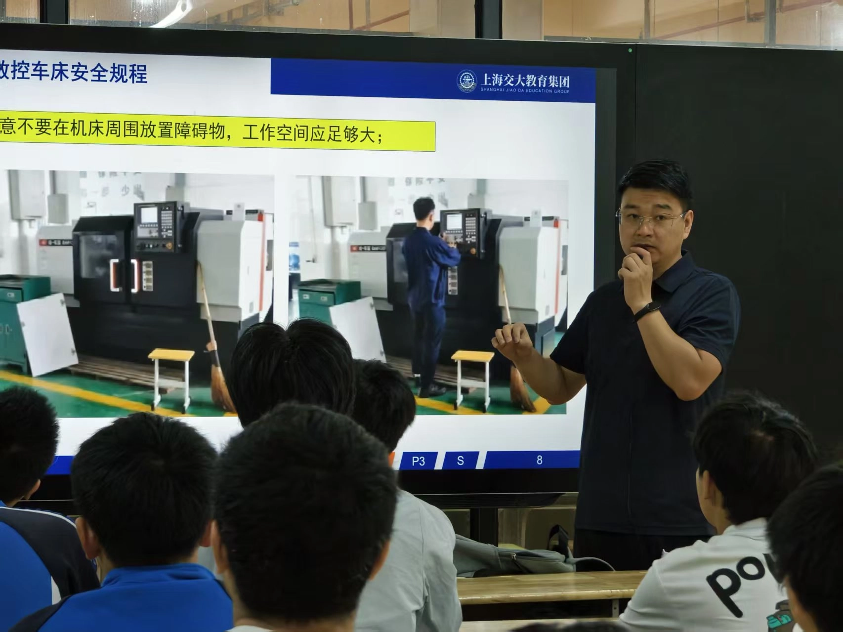 与此同时,另外三个实训室的演练也开展得如火如荼。在数控实训室,上海交大教育集团刘芳赟老师凭借多年一线工作经验,为学生们的安全演练提供了专业且精准的引导。他详细讲解了数控设备操作过程中的安全要点,针对可能出现的突发状况,传授了实用的应对技巧。同学们在刘老师的指导下,认真模拟演练,对数控设备的安全操作有了更深刻的理解。
