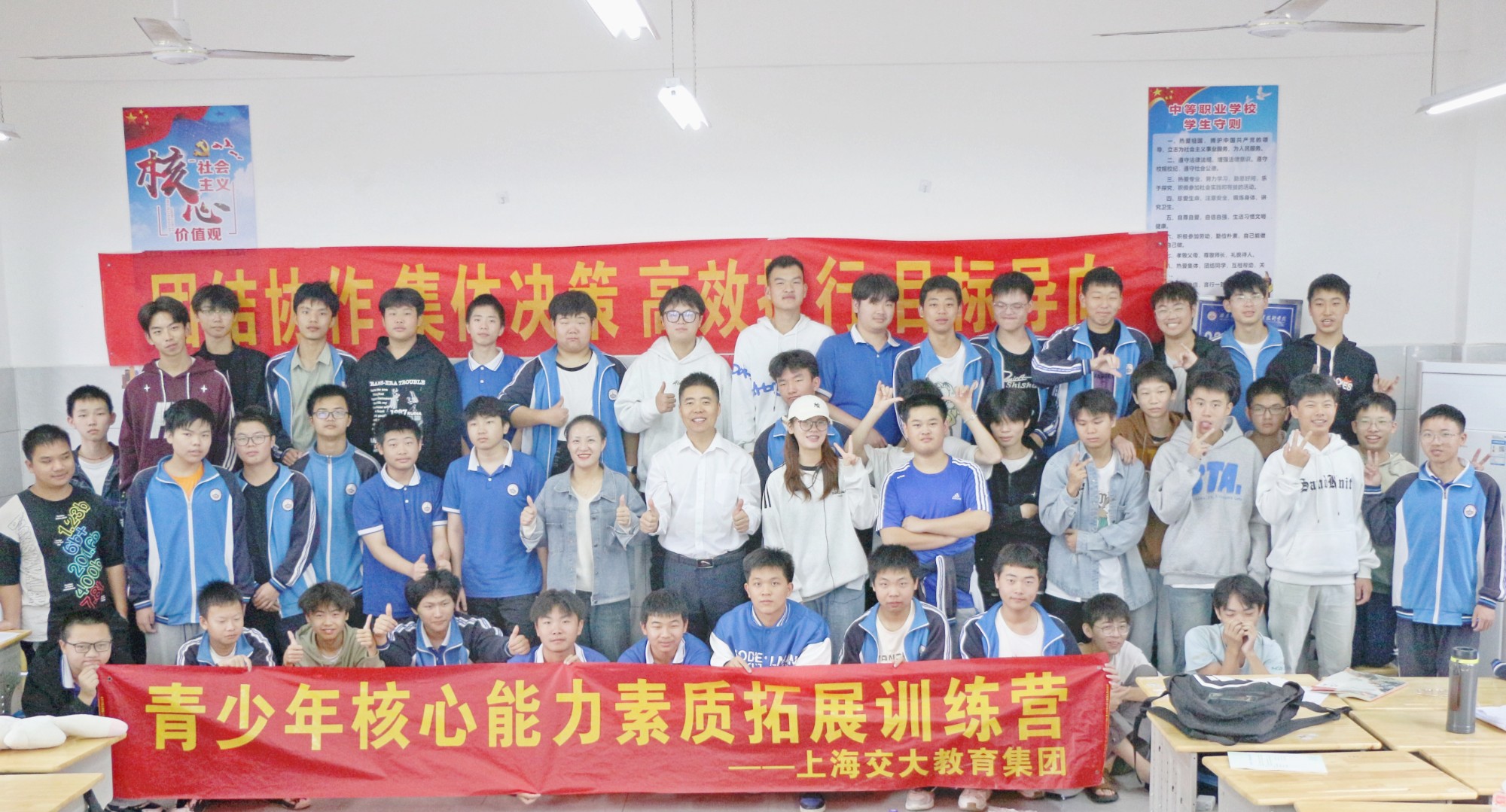 为了充实校企合作专业班级的文化内涵,推动其全面发展,上海交大教育集团教学总监携手教学助理教师,于2024年10月14日至15日,在邵东创新中等职业技术学校(以下简称邵东创新职校)的高二的四个校企合作班级中,开展了青少年核心能力素质拓展活动。