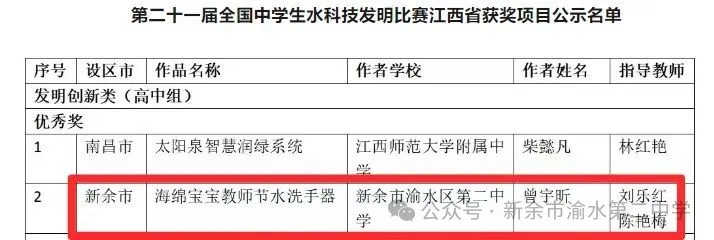 在第二十一届全国中学生水科技发明比赛中,上海交大教育集团新余渝水二中曾宇昕同学报送的3D打印作品《海绵宝宝教师节水洗手器》荣获全国优秀奖!