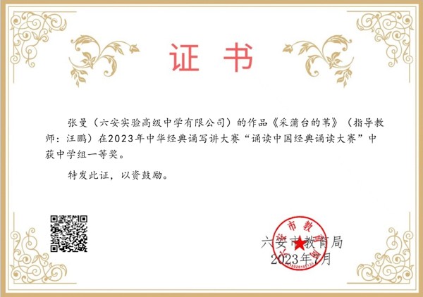 2023年10月,经过漫长的等待,第五届中华经典诵写讲大赛安徽省赛区结果出炉,我校作品喜获全省一等奖,并作为六安市唯一代表推荐参加中学生组全国大赛。