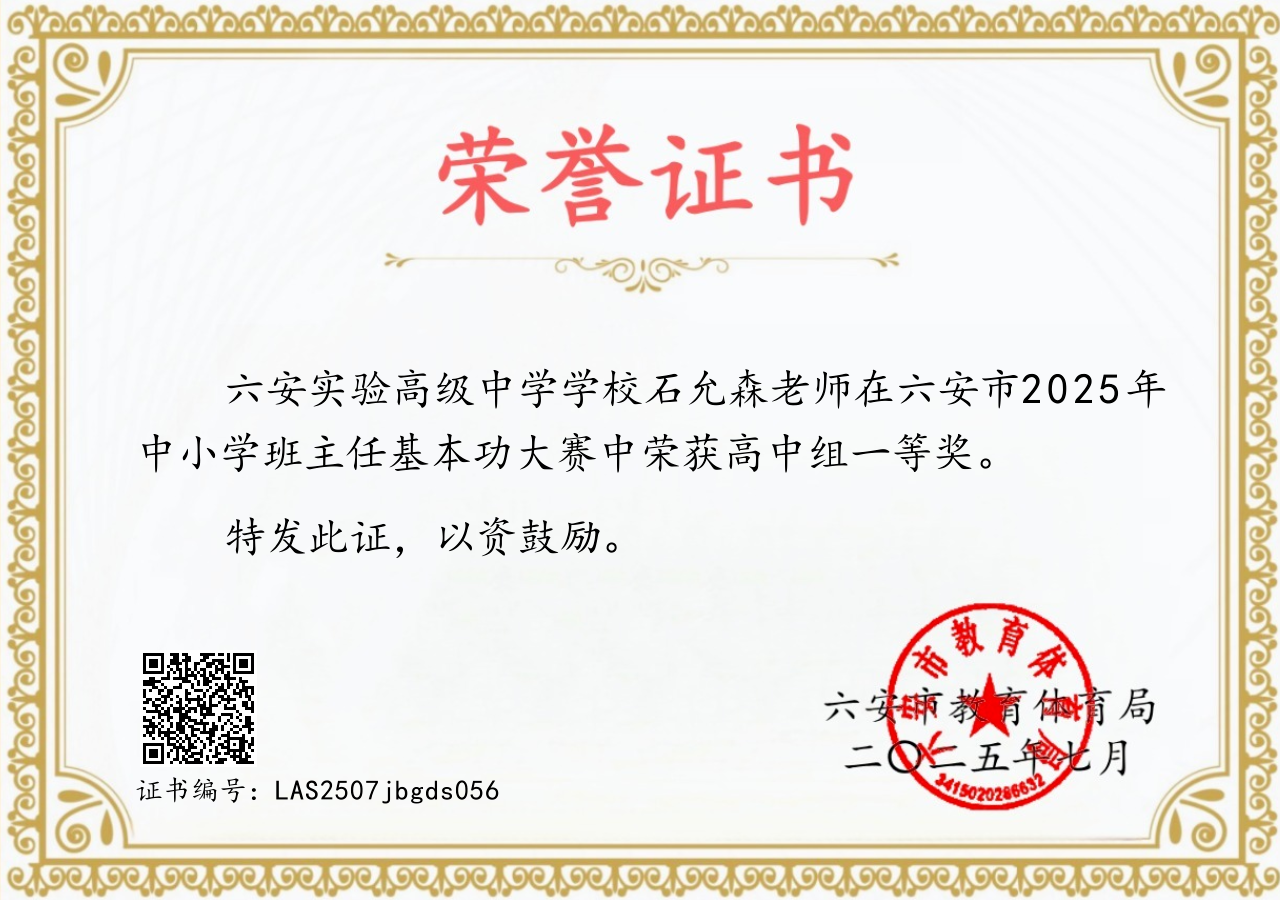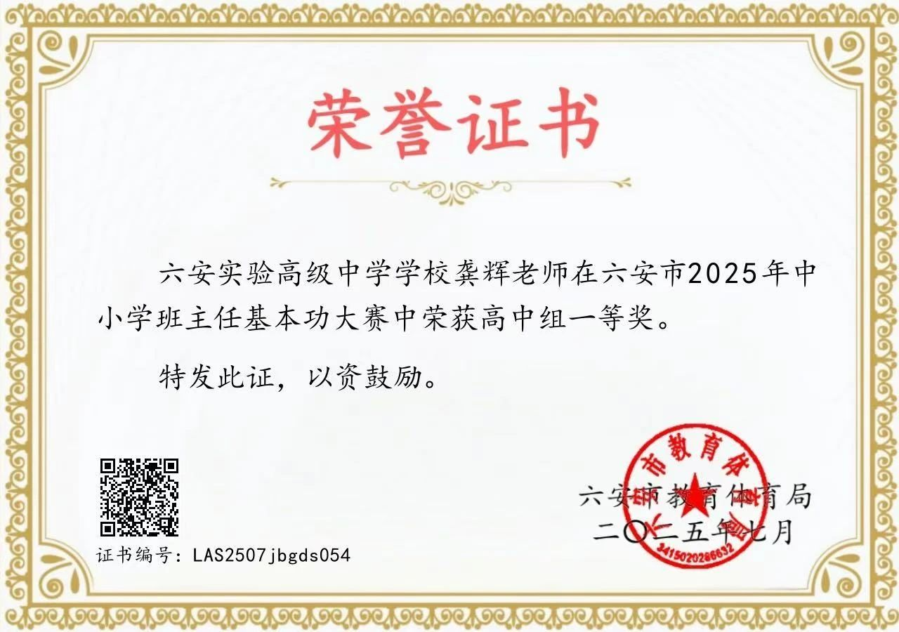 近日,由六安市教体局举办的2025年六安市中小学班主任基本功大赛落下帷幕,六安实验高级中学教师龚辉、石允森双双荣获高中组一等奖!获奖人数在全市各级各类学校中位列第一!同时也为全市仅有的两名民办高中教师!