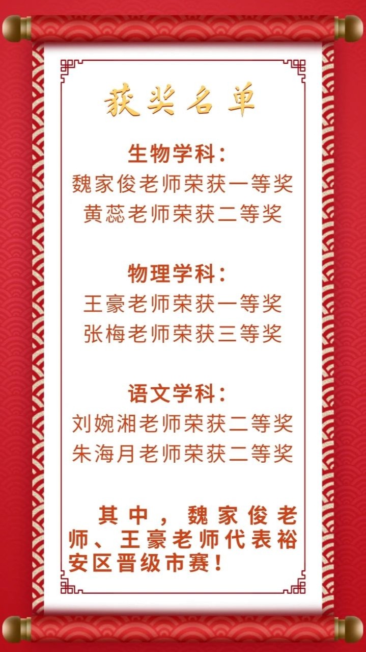 桃李蕴芬芳,耕耘结硕果。近日,在2024年裕安区教体局组织的语文、物理、生物学科的优质课比赛活动中,我校参赛教师充分展示了良好的精神风貌和精湛的授课技艺,彰显了独特的教学魅力,参加比赛的六位教师在此次评比活动中取得了优异的成绩。