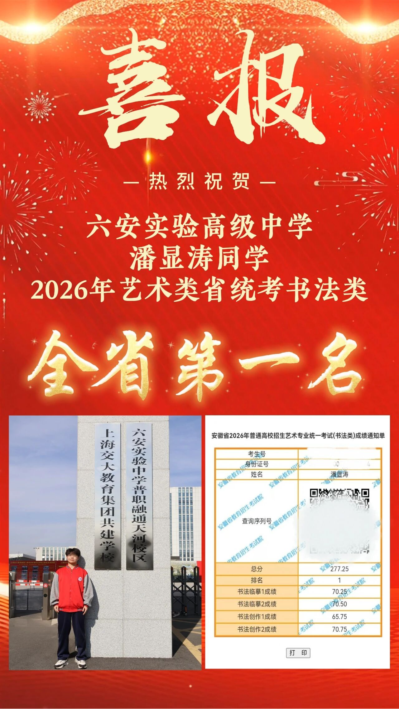 新年伊始,喜报频传。近日,安徽省2026年普通高校招生艺术类专业统一考试各大类成绩公布,我校潘显涛同学荣获书法类全省第一名!美术与设计类、音乐类、传媒类(含播音主持、表导演、舞蹈)等专业大类达线率均超过95%,我校达线人数、达线率、整体排名全面领跑,再创新高。