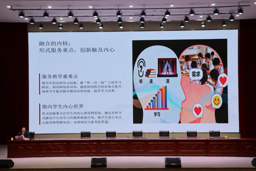 开幕式后,我校2025年中等职业学校公共基础课教师教学设计与展示活动全国一等奖获得者龚辉老师带来《从“新”到“心”——中职语文优质课的构建密码》的专题报告。龚老师结合自身参赛经历,用“原点、融合、赋能、抵达”四个关键词,深入剖析了中职语文优质课从教学设计到课堂实施,再到教学反思的全过程。他强调要以学生为中心,关注学生的兴趣点和需求,将新的教学理念融入课堂,用真心去打造每一堂语文课,让课堂充满活力与温度。其精彩的分享为参会教师提供了宝贵的借鉴和启示,赢得了现场阵阵掌声。