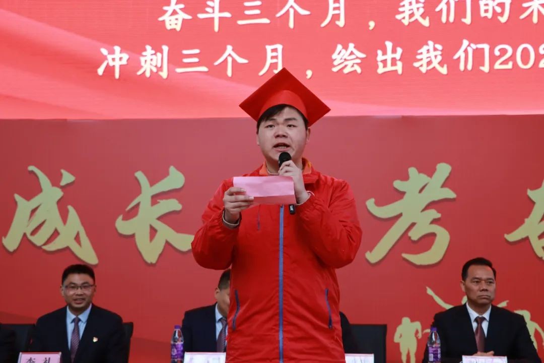 十八而志,大任始承。2109班陈磊同学作为学生代表发言。感恩老师、感恩父母,我们已经长大,最后三个月,我们定当全力以赴,我们定当再创辉煌!随后,高三全体学子在2138班卢文颉同学带领下进行宣誓,用锐不可当的气势喊出高考冲刺口号,为自己加油鼓劲,呐喊助威。相信同学们定能不负青春,圆梦六月!