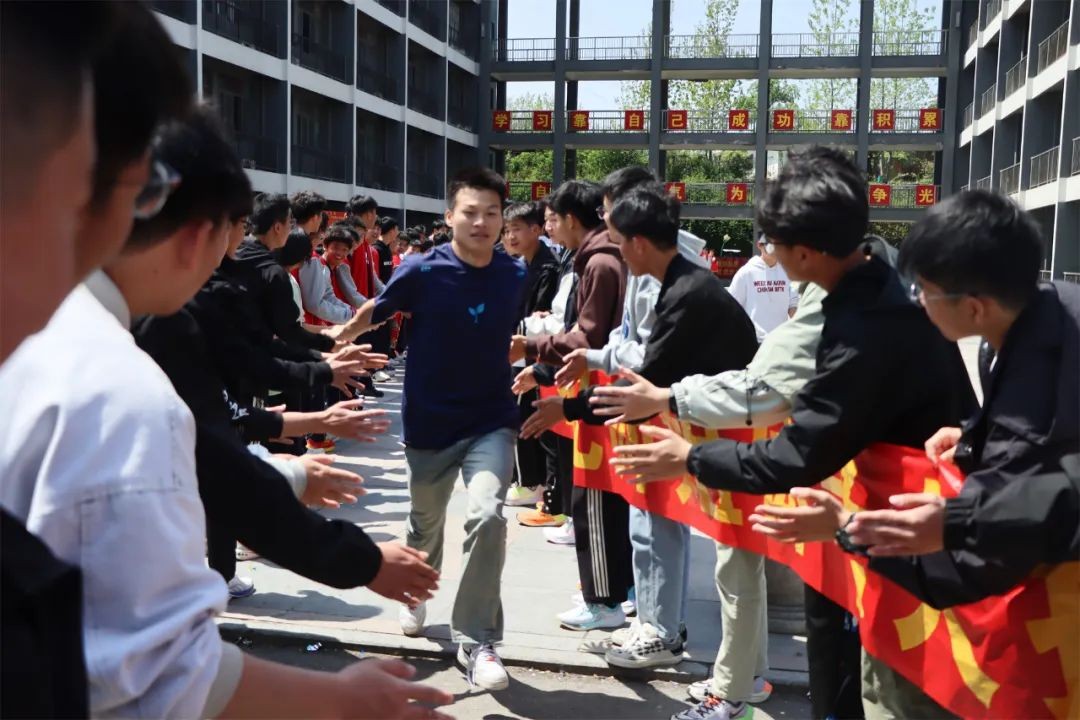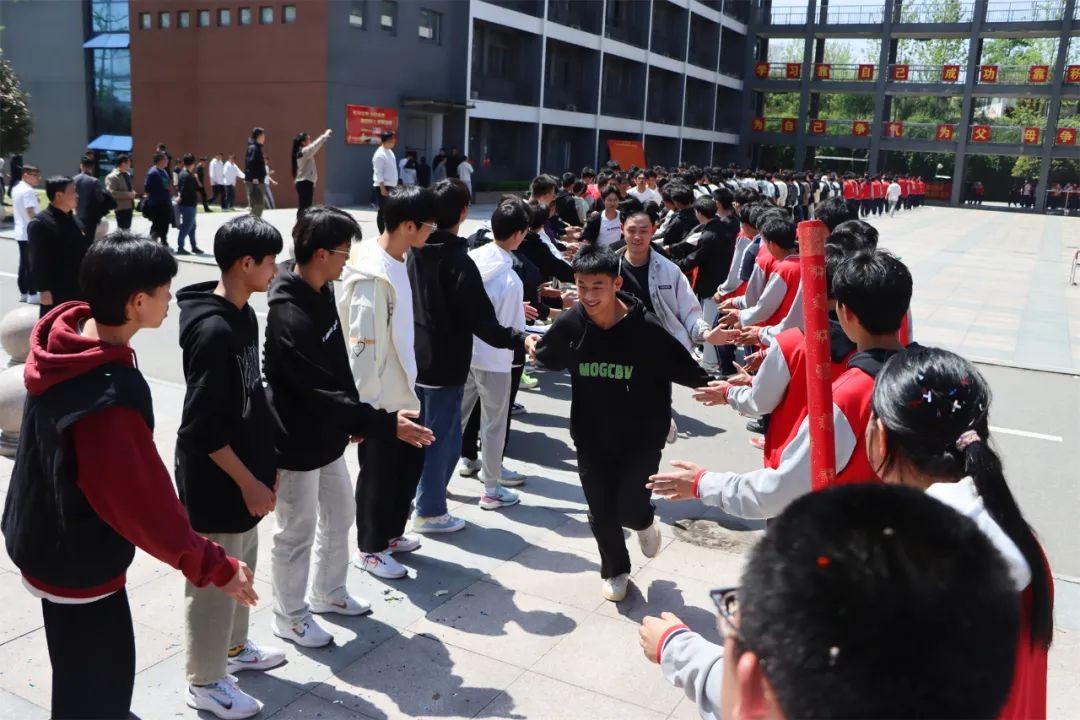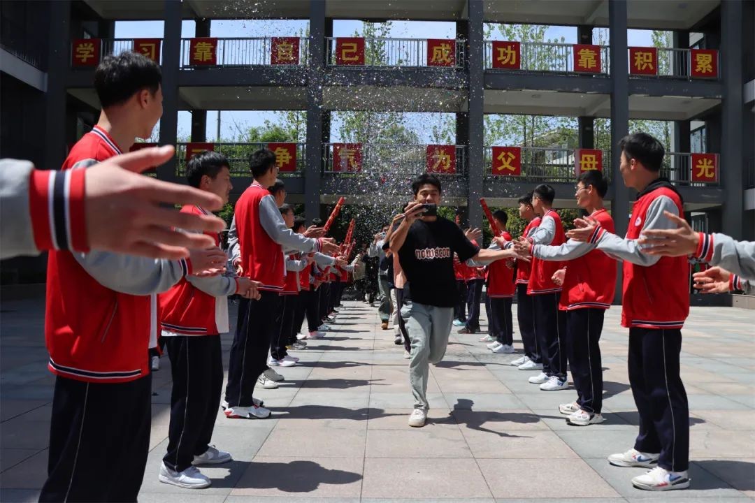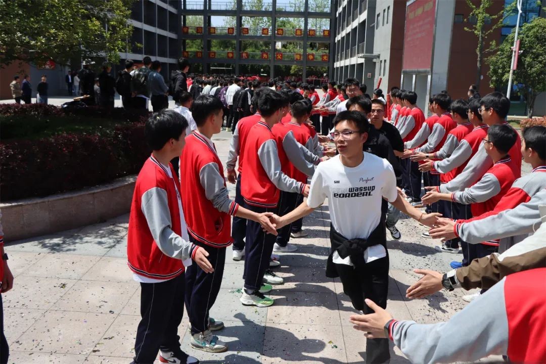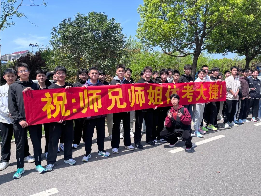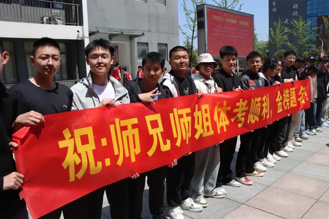 高一、高二的学弟学妹们夹道欢送师兄师姐,制作了标语横幅,准备了手持彩炮,为他们加油鼓劲。体育生们迈着坚定的步伐,一路击掌,挥手致意,祝福声、呐喊声响彻校园,令人热血沸腾。