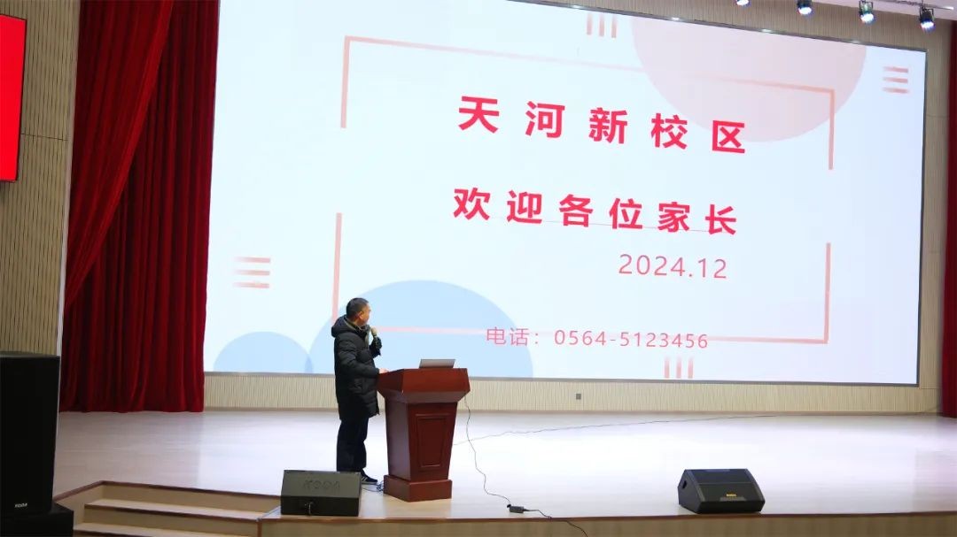 第一阶段,家长会在慧源堂报告厅举行,由高一年级部主任魏超主持。安徽天河教育集团董事长张运来致欢迎辞,执行校长黄霍胜作专题讲座。黄霍胜从学校的办学理念、办学宗旨和培养目标、文化育人、活动育人、家校共育和学校未来发展等多个方面进行阐述,为家长们进行了系统介绍。