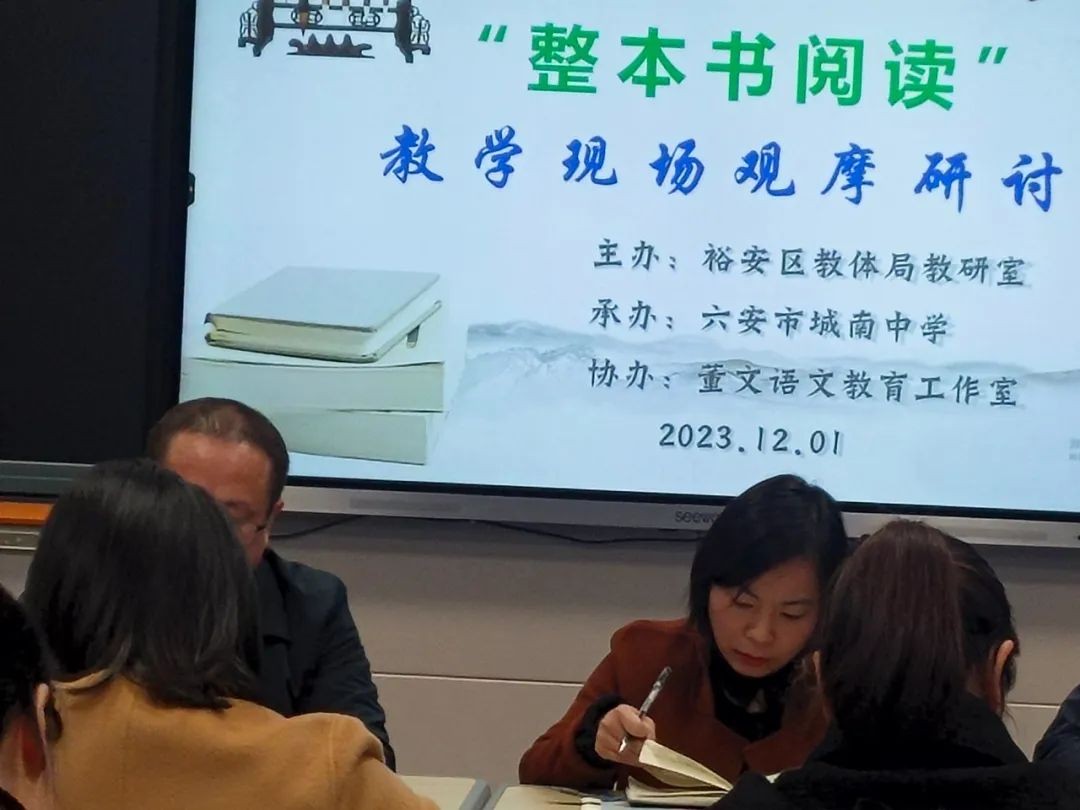 在三新背景下,为扎实推进裕安区整本书阅读教学,促进裕安区高中语文教师深入开展整本书阅读教学策略研究,提升教学水平,裕安区教体局教研室于12月1日下午在城南中学举办了裕安区高中语文“整本书阅读”主题教研活动。我校语文教研组长、高一语文备课组长和骨干教师积极参会,认真学习聆听,领会教研精神,为高一的整本书阅读做好规划和部署。