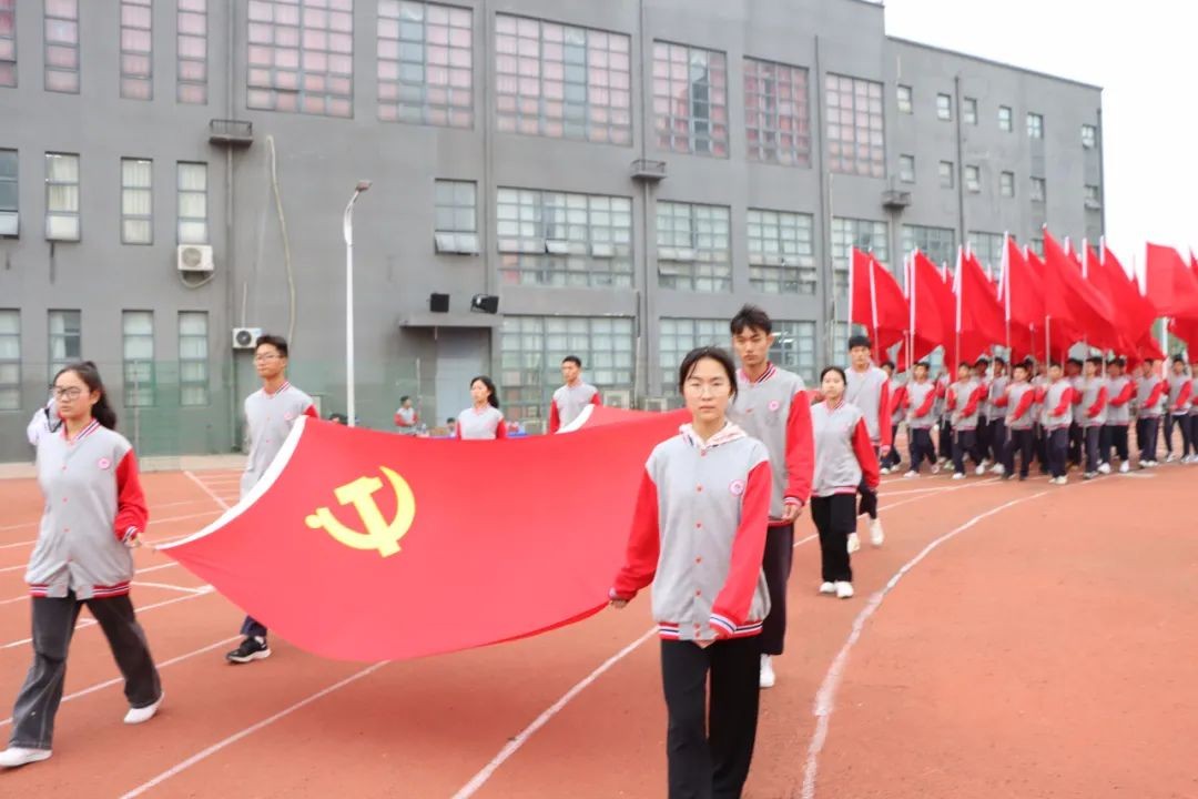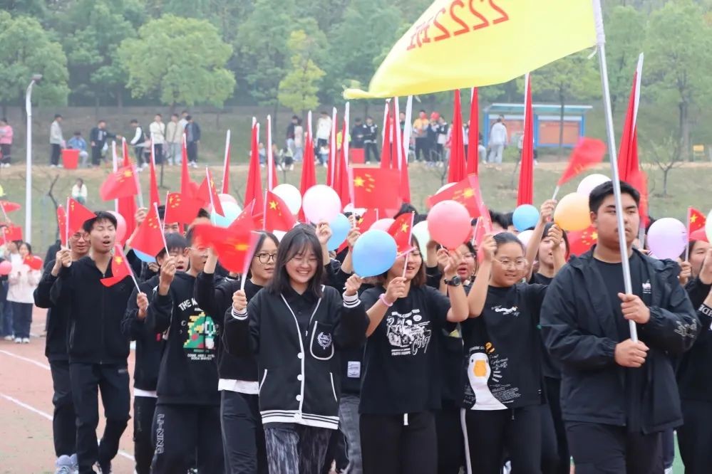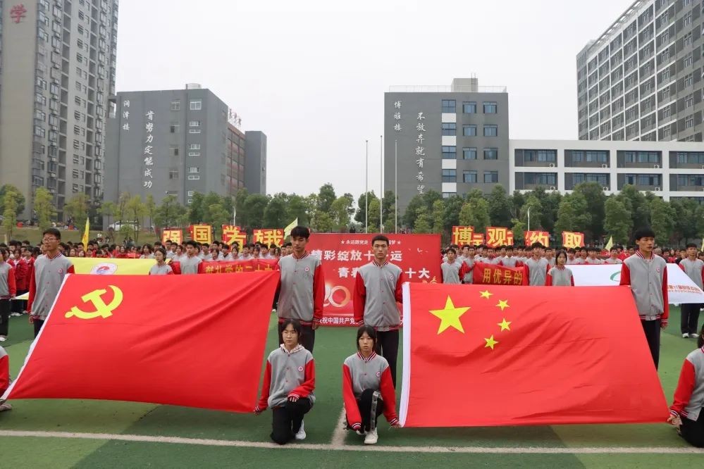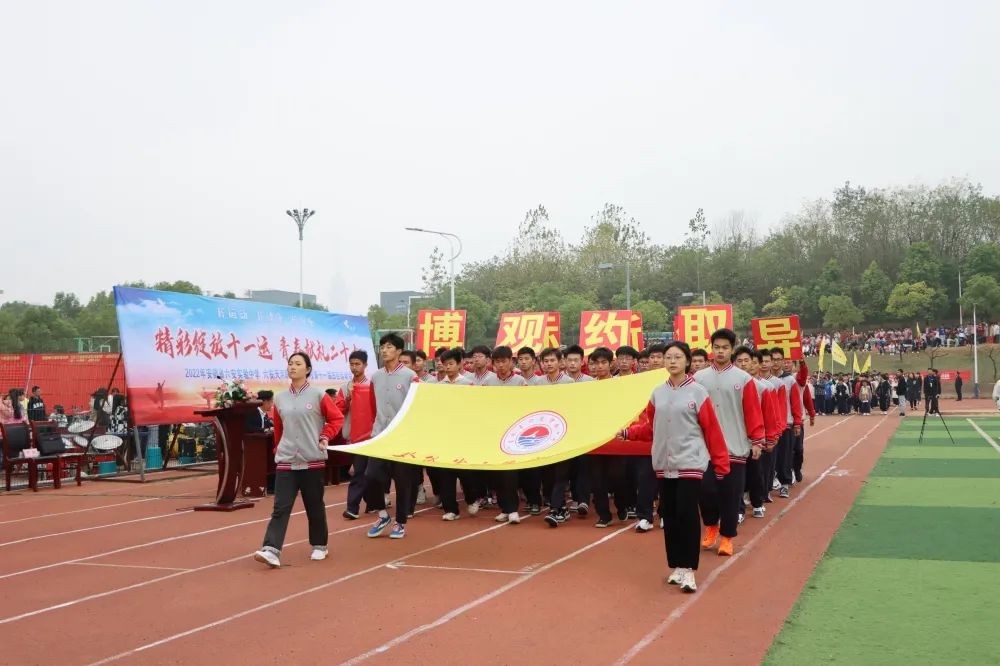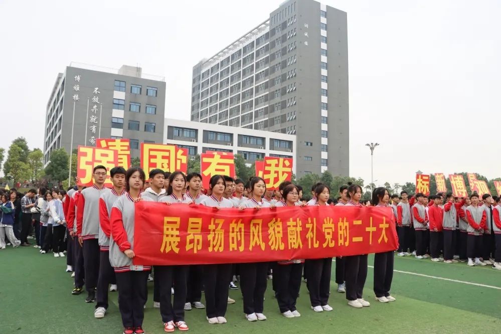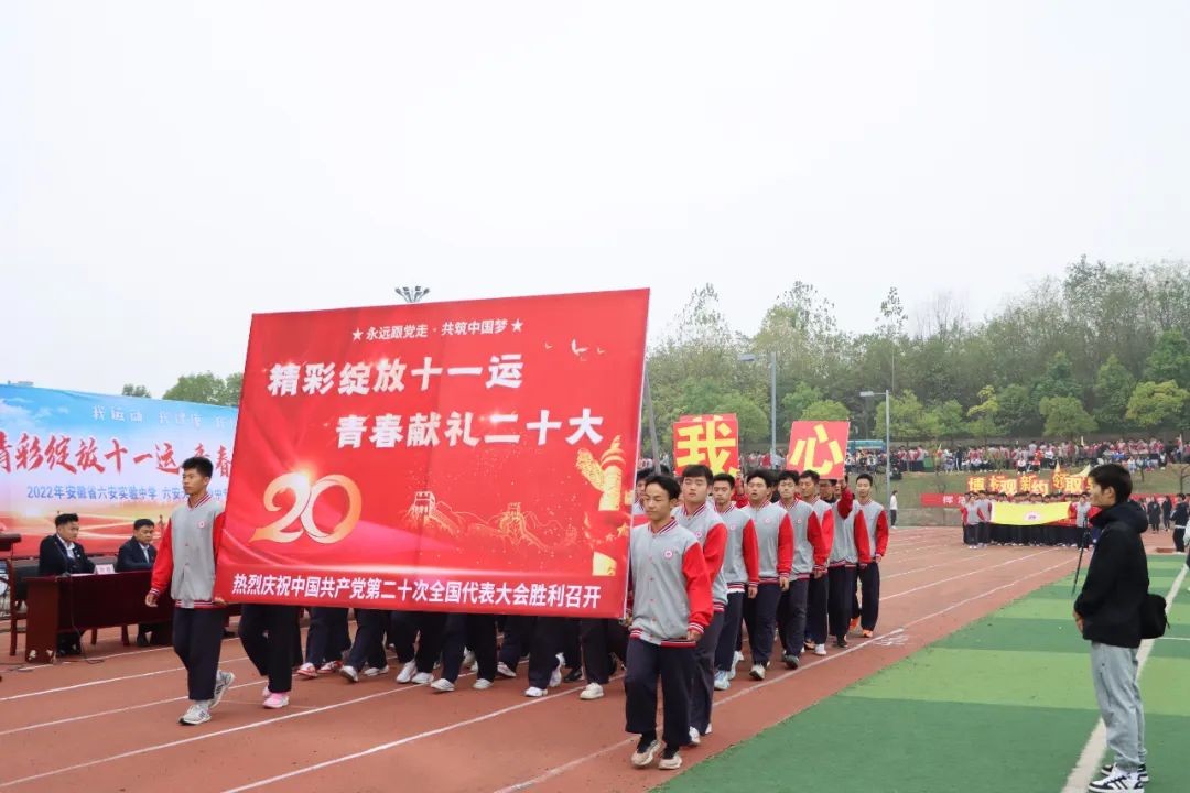 上午8时,在激昂的音乐声中,开幕式正式开始。首先入场的是由党旗、国旗和36面红旗组成的方阵,表达了实验人赓续红色血脉,为党育人、为国育才的教育使命。紧接其后的是“献礼二十大”特色方阵和喜迎建校十周年方阵。同学们高举“精彩绽放十一运,青春献礼二十大”宣传标识,表达了青年一代坚定信念跟党走的决心;高举“请党放心,强国有我”的宣传标语和“博观约取,标新领异”的校训,表达了广大学子立志报国的责任与担当。