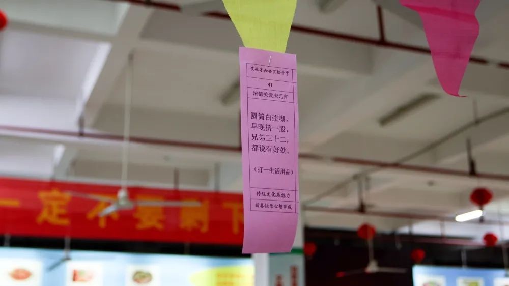 张灯结彩过十五,欢天喜地庆元宵。2月5日,在癸卯兔年元宵佳节到来之际,为了弘扬民族文化,让学生体验元宵节猜灯谜、吃汤圆的传统习俗,丰富校园文化生活,营造喜庆、祥和的节日氛围,六安实验中学在食堂开展了“我们的节日·元宵节”主题活动。