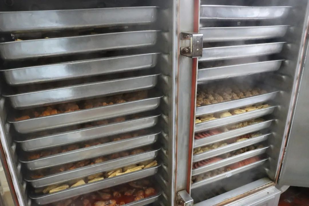 学校从就餐时间和保温方法入手,解决了饭菜变凉的问题。各年级就餐时间分段,餐厅安装保温门帘,每餐次热菜从出锅到餐盘不超过6分钟,烧菜采用专业保温设备保温,提前打开保温售卖台,保证温度达标,量较大的菜肴,采用集中保温、分段供餐的形式来保证温度。