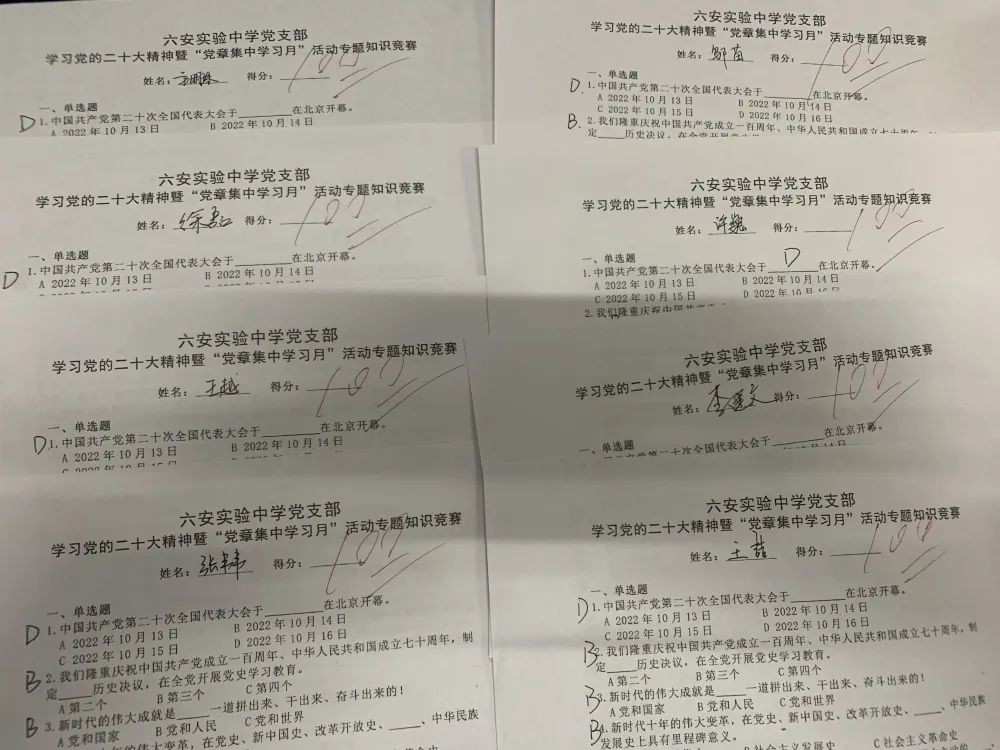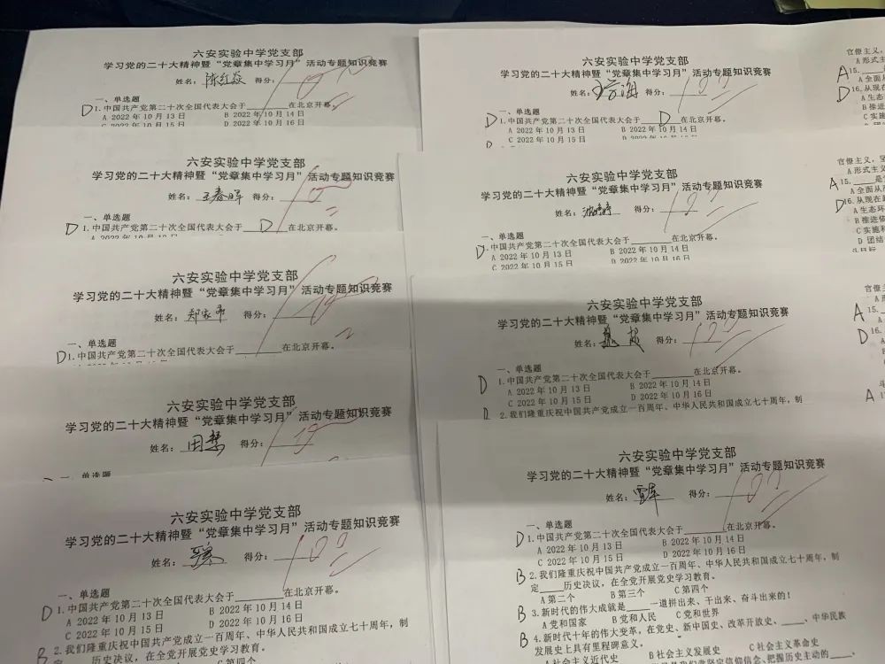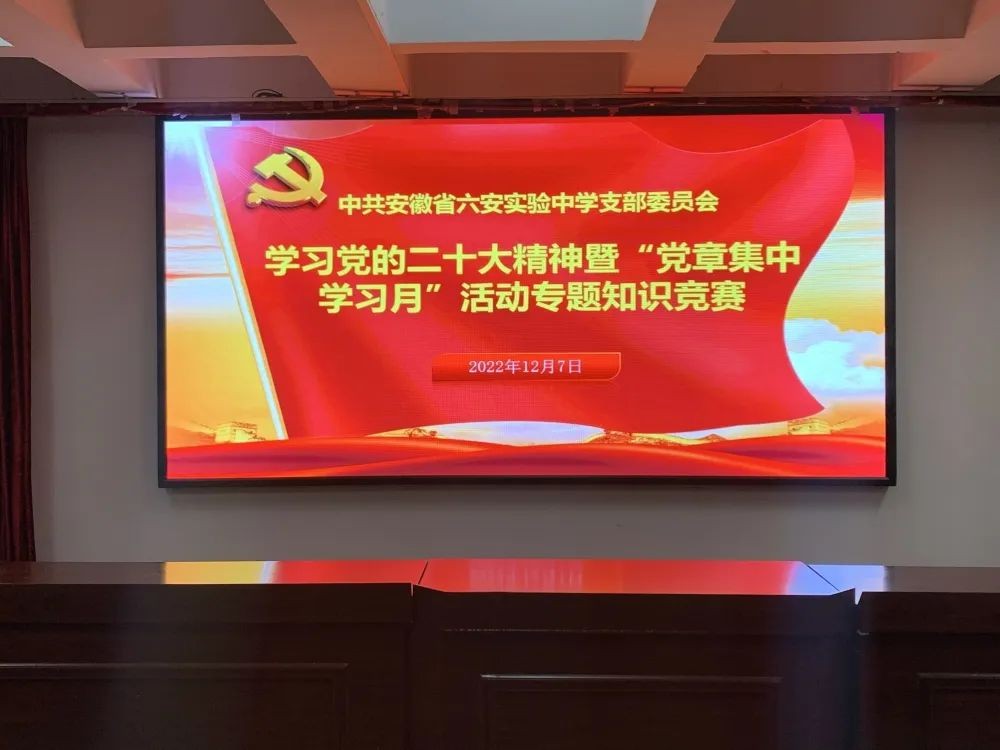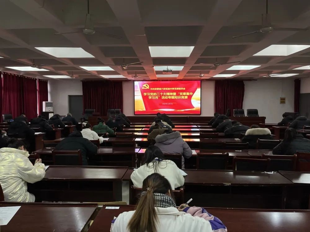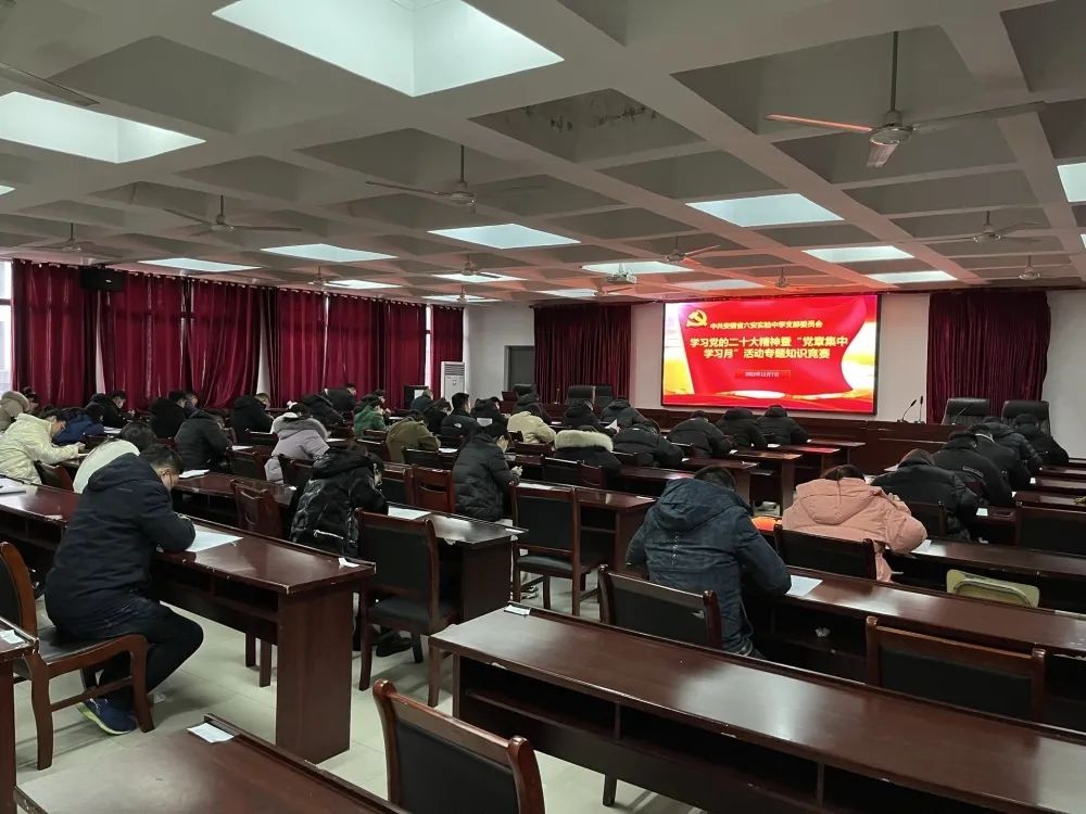 为进一步掀起学习宣传贯彻党的二十大精神热潮,检验学习成效,巩固学习成果,努力营造“比、学、赶、超”的浓厚学习氛围,12月7日下午,六安实验中学党支部在博观楼五楼会议室开展了学习党的二十大精神暨“党章集中学习月”活动专题知识竞赛。全体党员参加了本次活动。