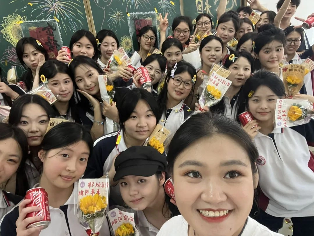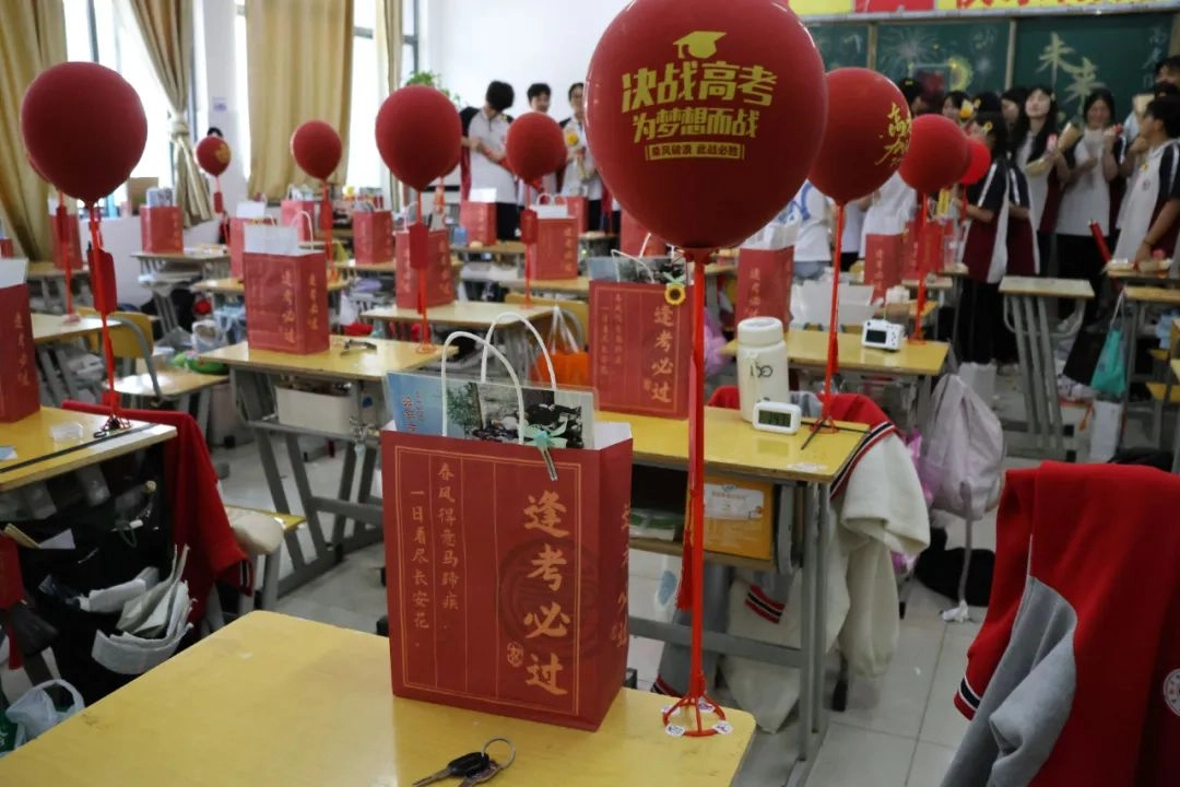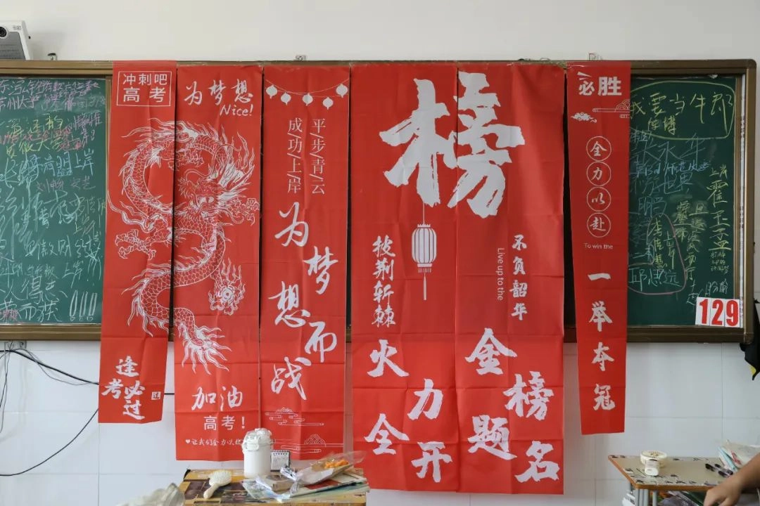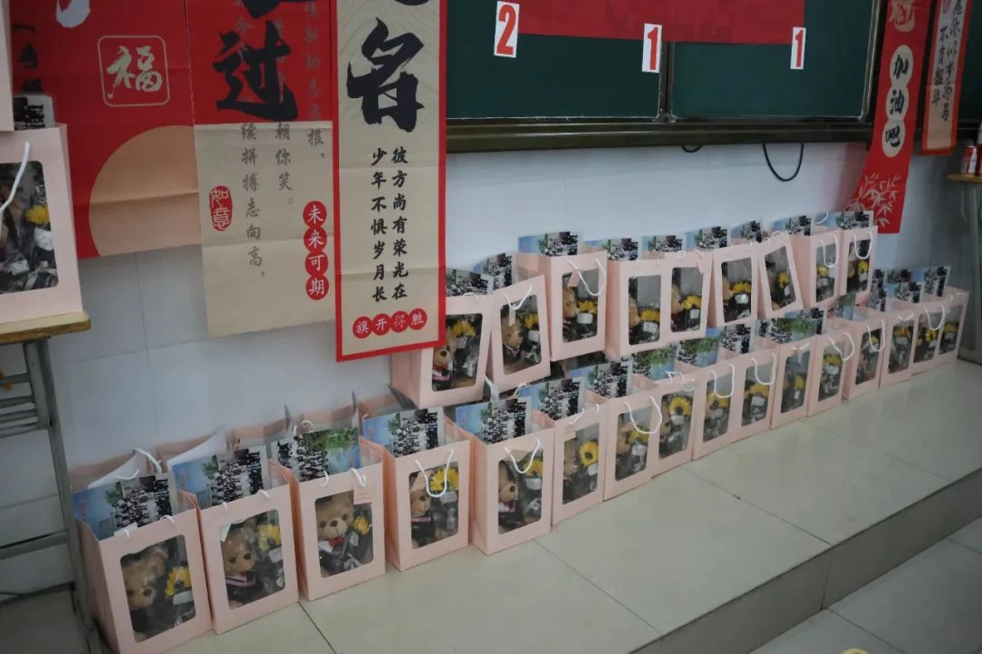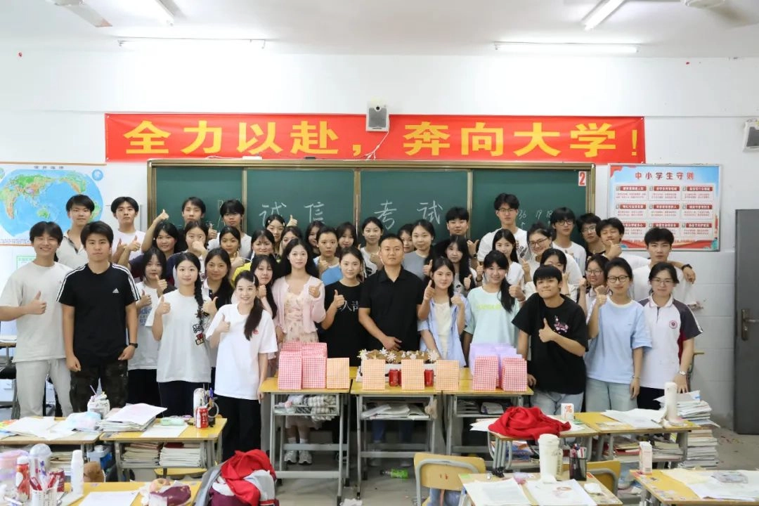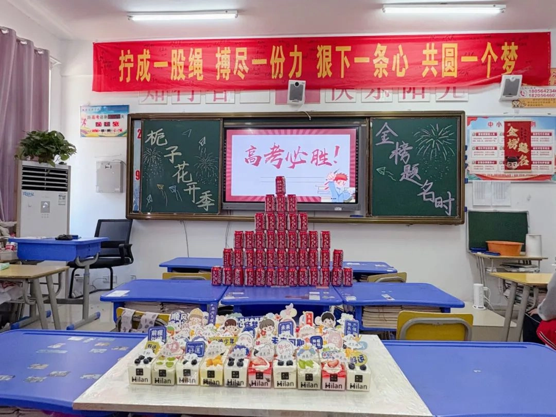 班主任化身能工巧匠 将鼓励藏进门楣高悬的粽子 将祝福写满黑板角落的星语心愿 一枚枚定制的“金榜题名”的手链 一罐罐寓意着“逢考必赢”的可乐 是最接地气的“法力加持” 请以笔为戈 以卷为疆 在这流火的六月 尽情挥洒你们的璀璨光华