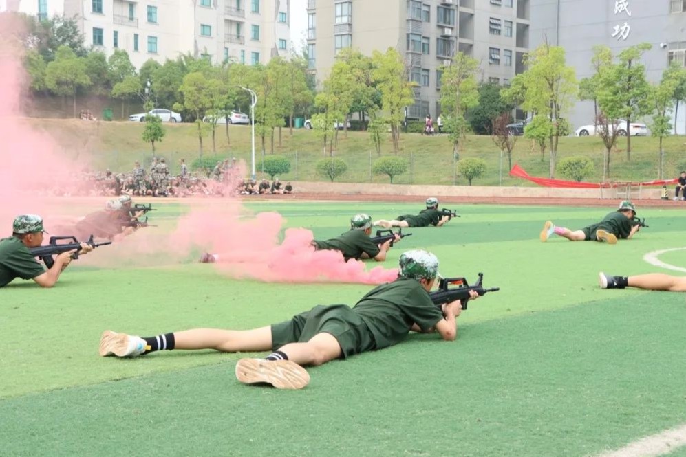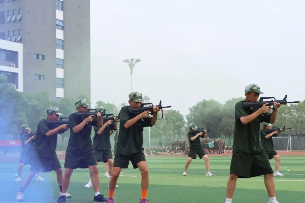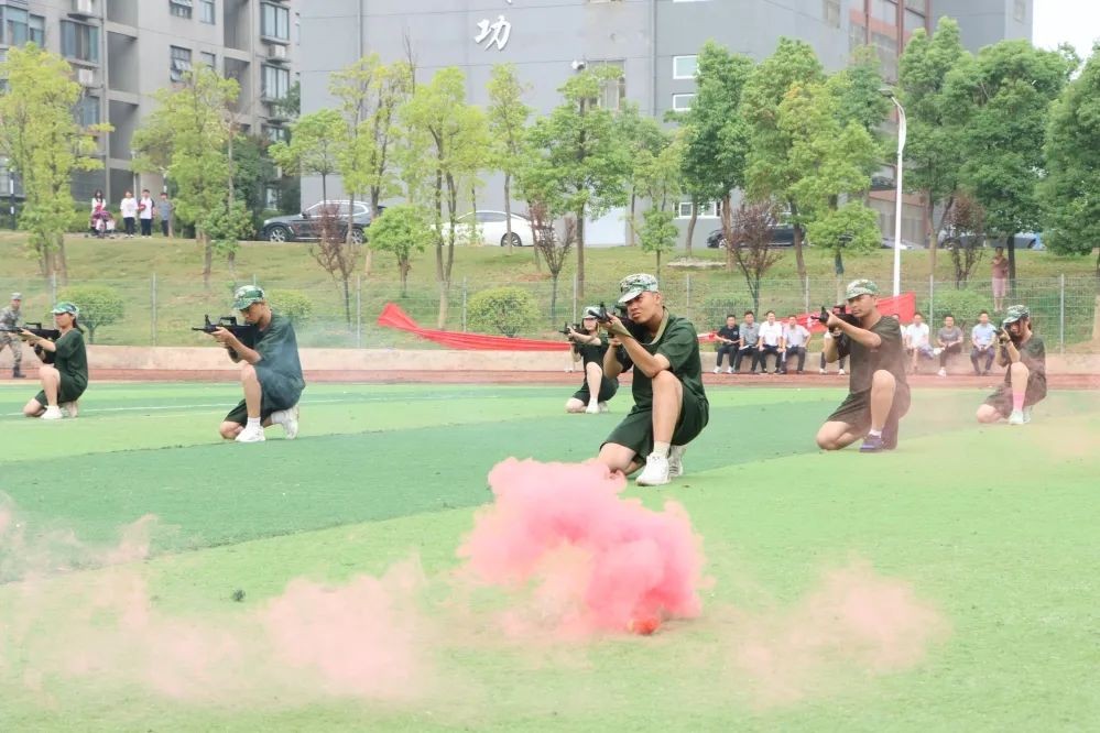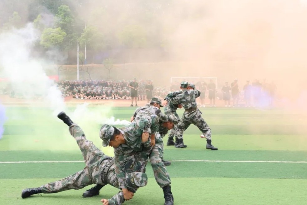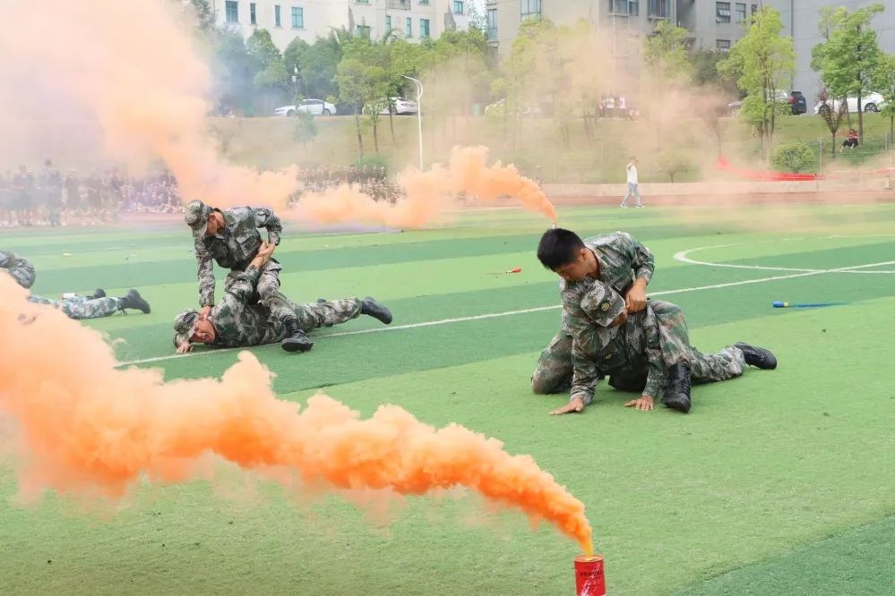 随后,参训学生进行了军事训练成果汇报表演。队列方阵整齐划一,令行禁止;手语操方阵青春激昂,气势饱满;擒敌拳方阵气势磅礴,虎虎生风;匕首操方阵动作娴熟,英姿飒爽;韵体操方阵青春动感,活力四射。最令人激动的是特色战术演练方阵,他们手持道具钢枪,穿过弥漫硝烟的战场,与对面的“敌人”来一场智慧与勇气的对抗,台上台下掌声不断。