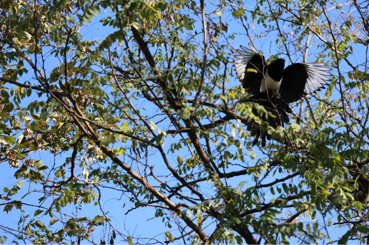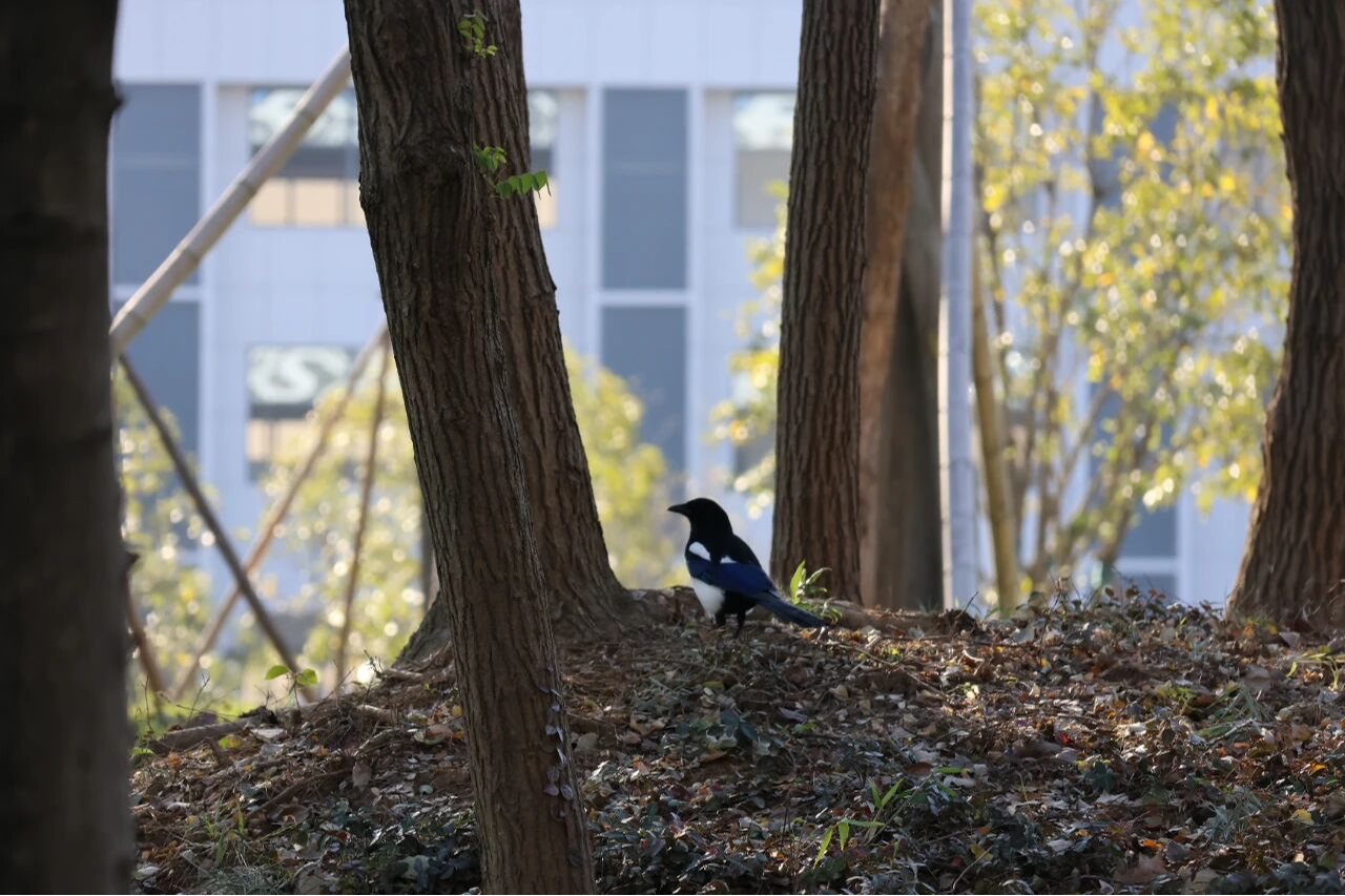 校园各处的小树林是鸟儿的家园。灰喜鹊是其中最活泼的演员,它们蓝灰色的身影在枝头跳跃,叫声清亮如撒落一地的铃铛。斑鸠则含蓄得多,常成对站在屋檐或树杈上,“咕咕咕”的啼鸣像温柔的背景音。校园里五六种鸟类与学生共享作息:晨读时最欢腾,上课时静悄悄,放学后又热闹归巢。