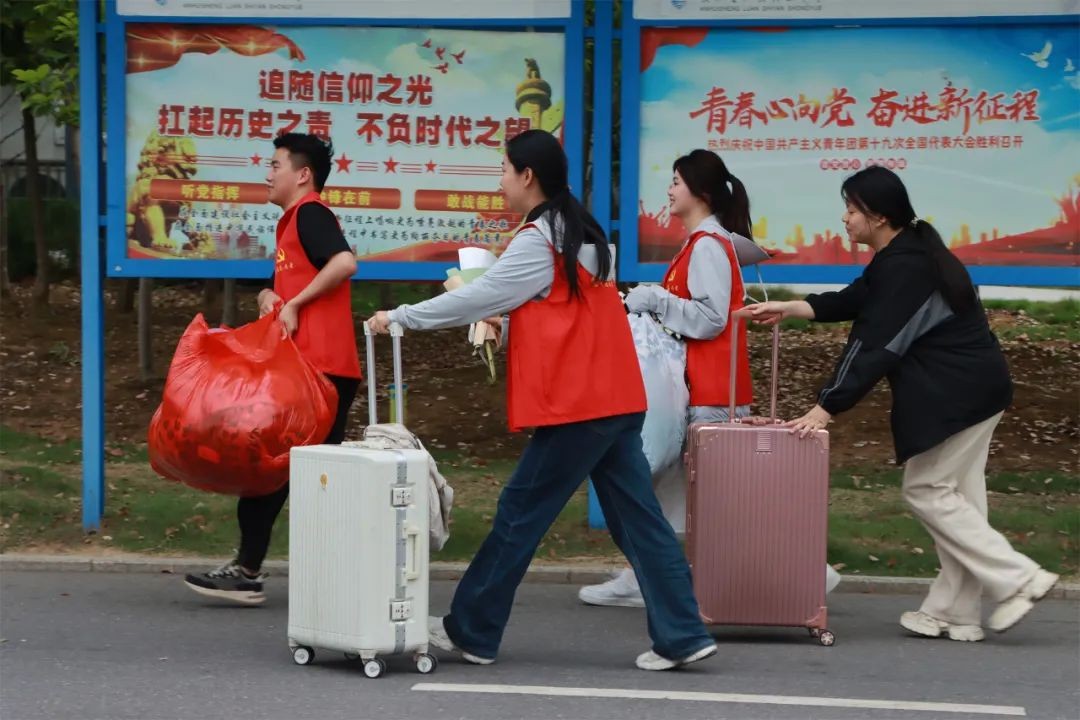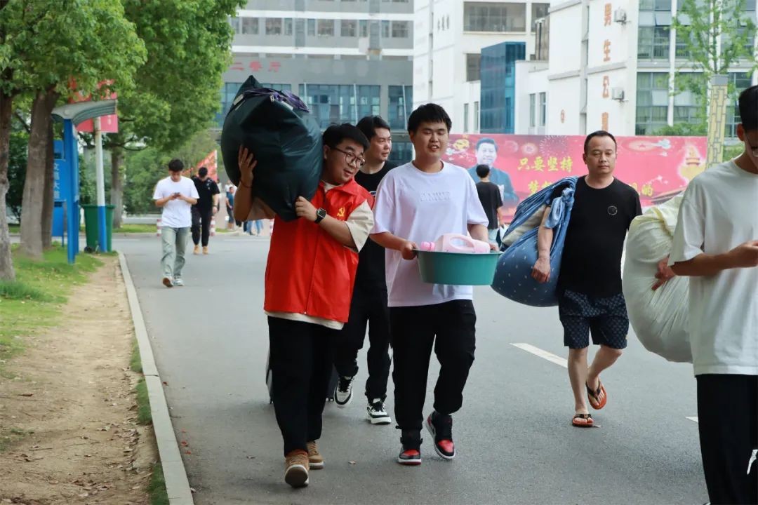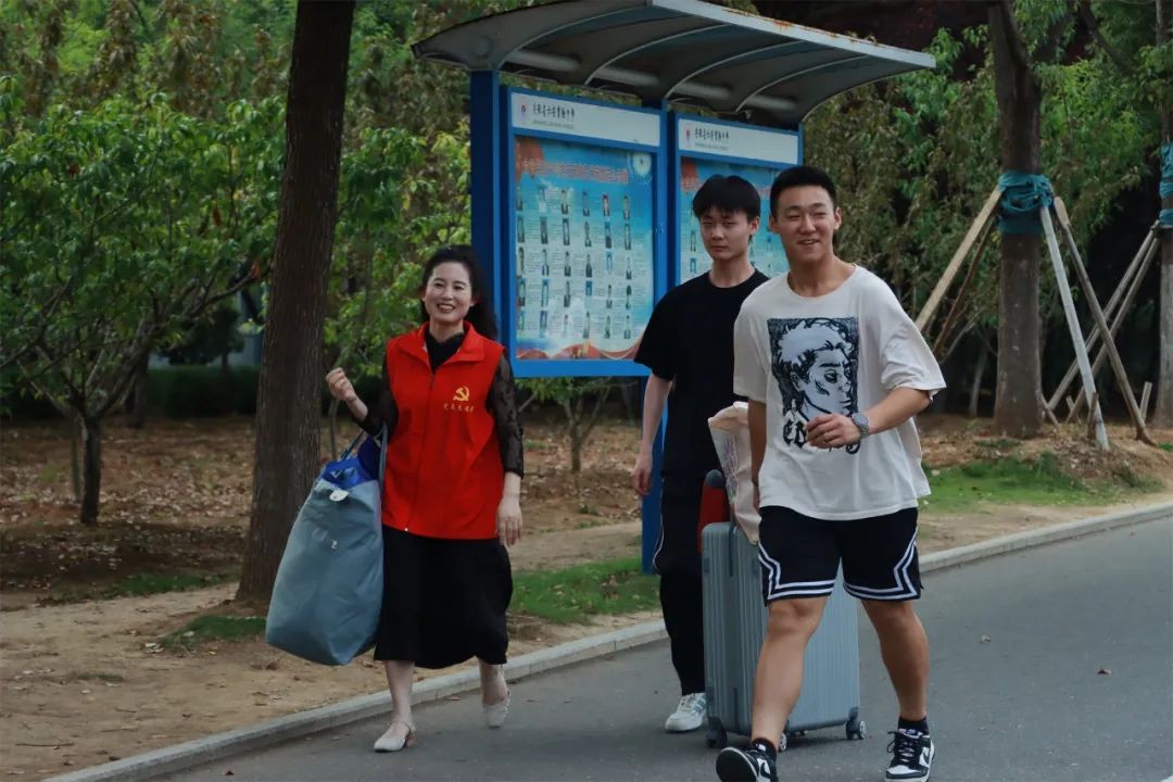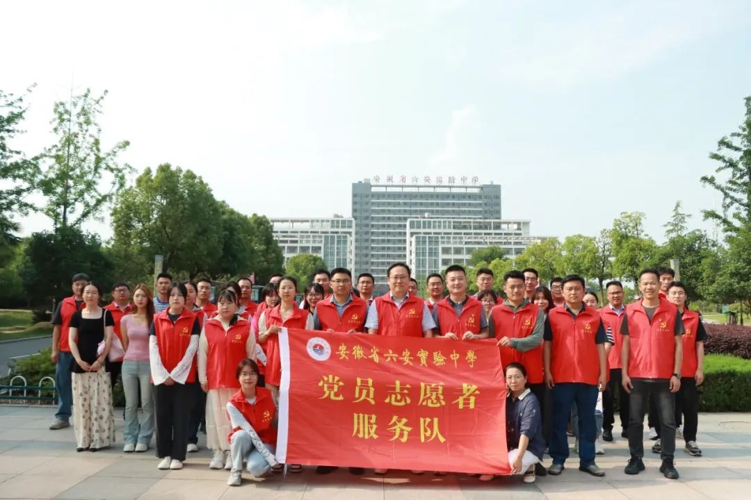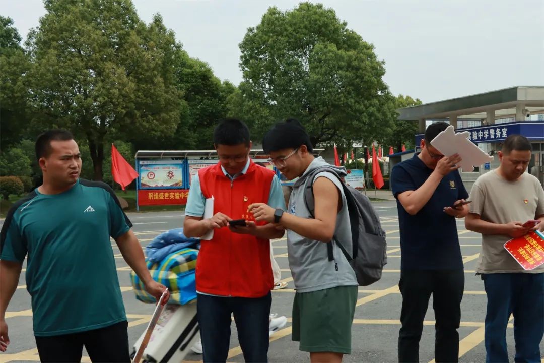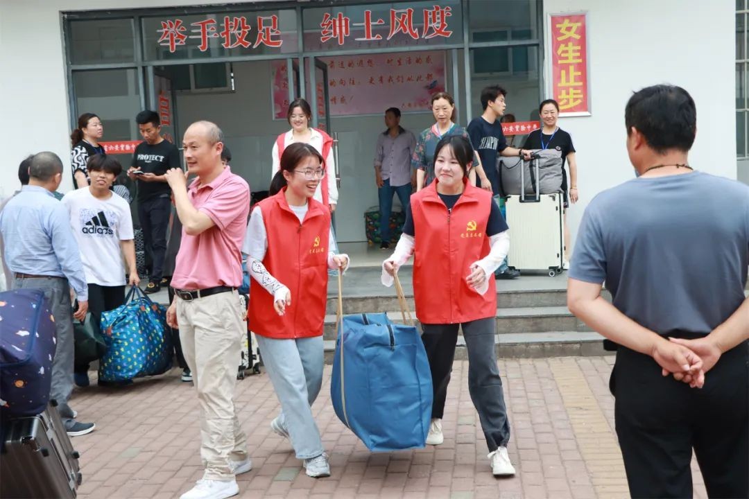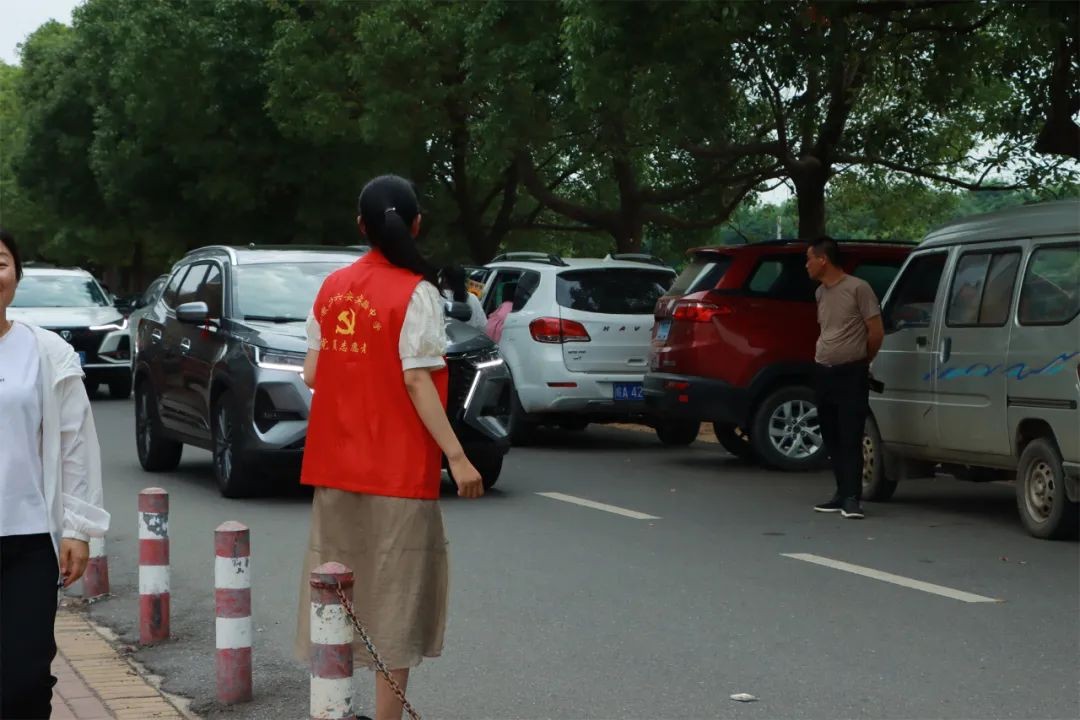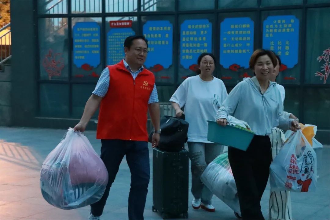 党旗飘扬践初心,为民服务显担当。党员教师们身穿红马甲,为学生和家长提供一切协助和服务。有的维持秩序,引导家长将车辆有序停放,保证道路时刻通畅;有的在宿舍楼下积极主动地帮助搬运箱包。从酷热的下午到夜幕降临,校园里一个个跃动的红马甲,汗水和笑容一同挥洒,充分体现了党员教师的先锋模范作用和用心用情、热情服务的良好精神风貌。