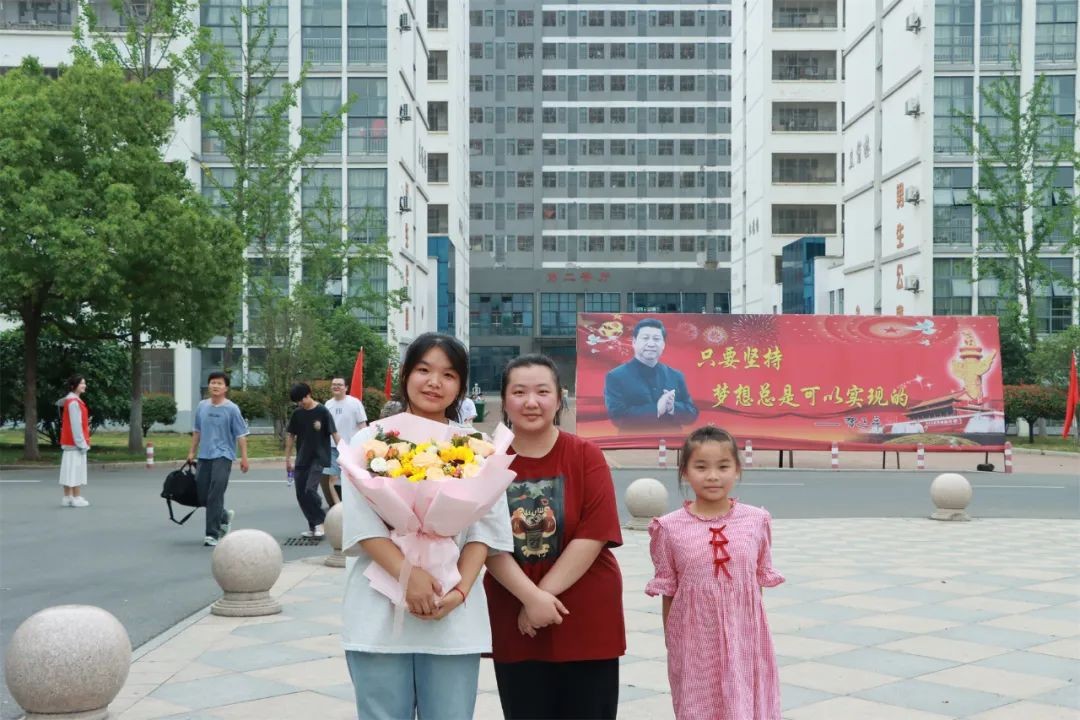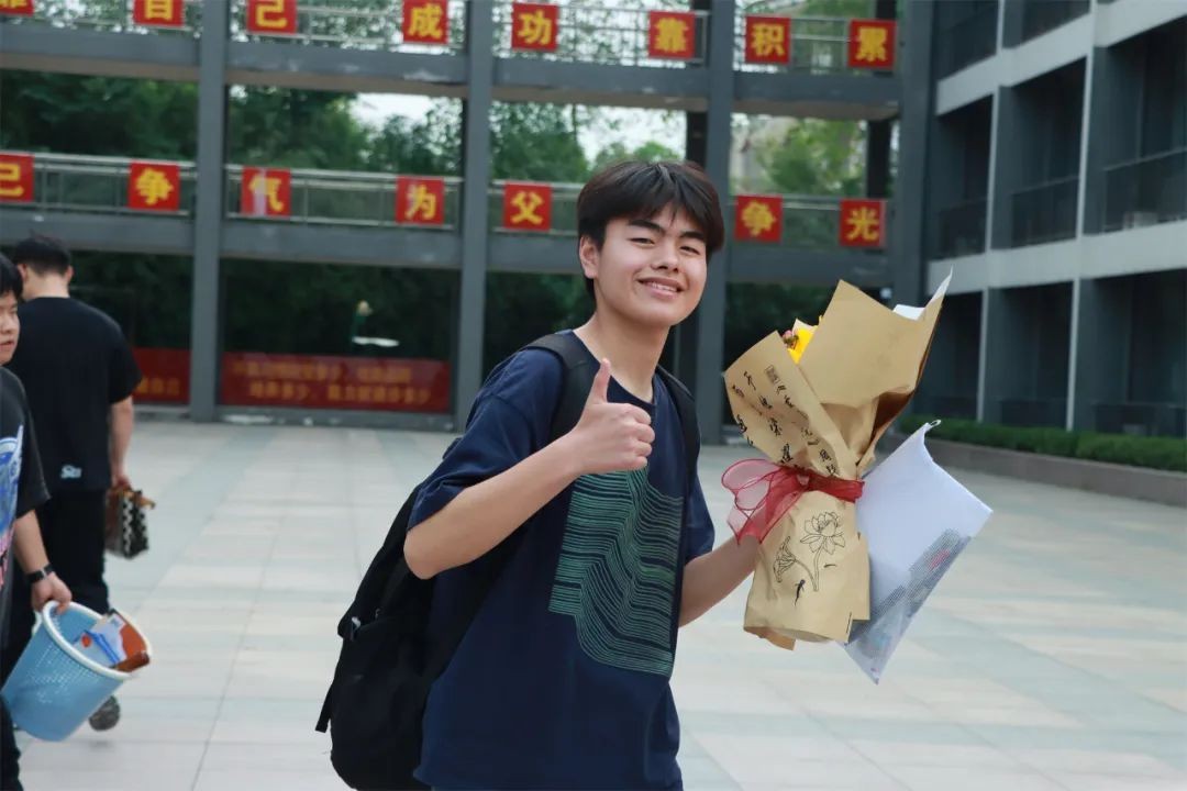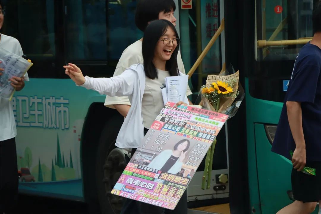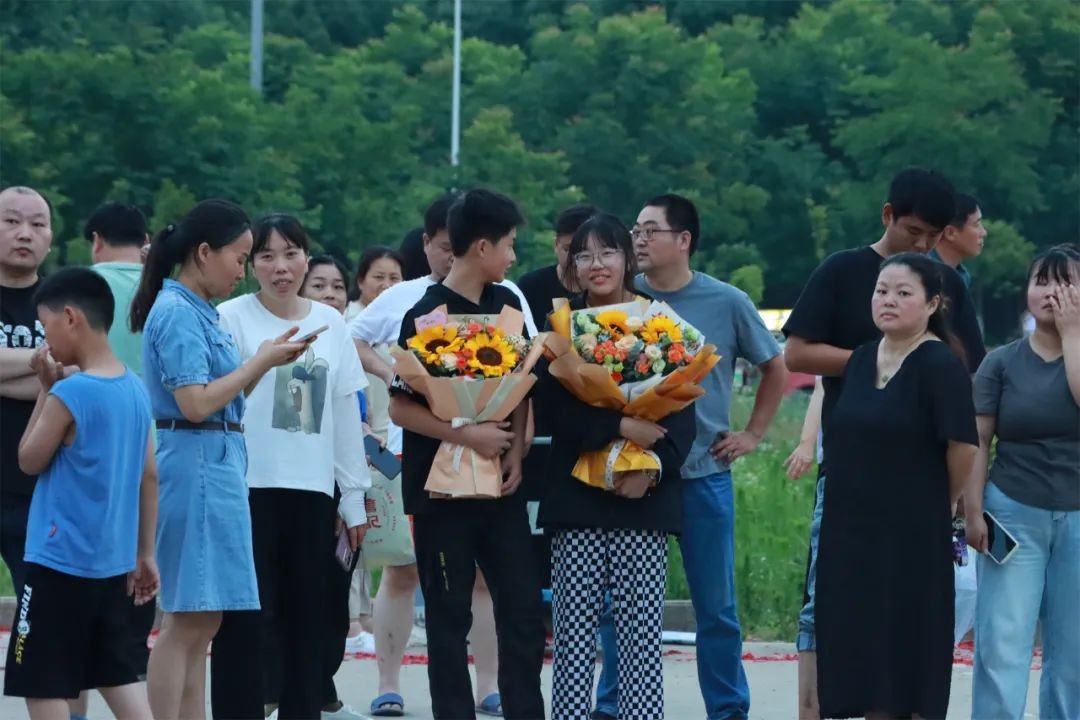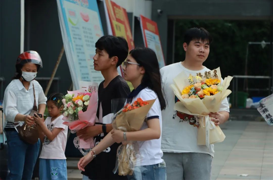 爱子心无尽,归家喜及辰。6月9日下午,学校门口早早站满了等待考生的家长们,他们手捧鲜花、礼物和横幅,翘首以盼,迎接考生凯旋。考生返校后,亲友们迫不及待地上前拥抱,送上鲜花和祝福,祝贺孩子们勇敢、顺利、圆满完成了青春的挑战。