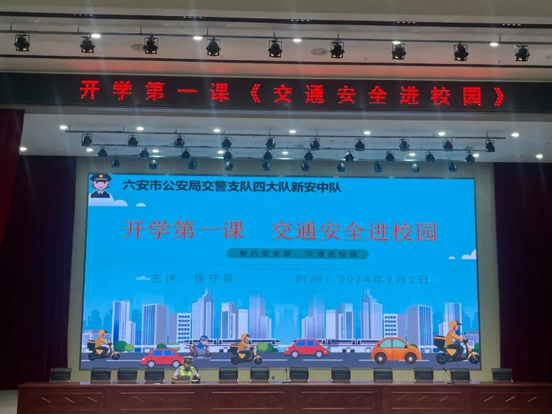为进一步加强在校学生的交通安全宣传教育工作,有效预防学生交通事故的发生,切实提高在校学生“知危险,会避险”的应变能力,9月2日,六安市公安局交警支队四大队新安中队来到我校,开展“开学第一课”——《交通安全进校园》专题讲座。活动由新校区高二年级部副主任毛名松主持。