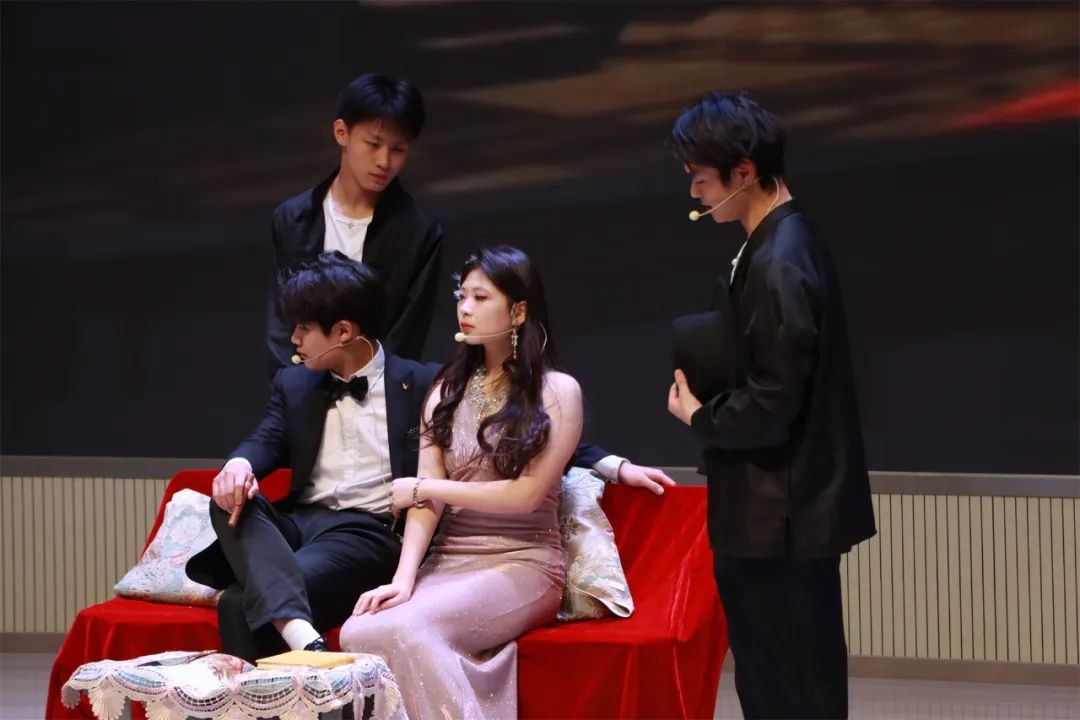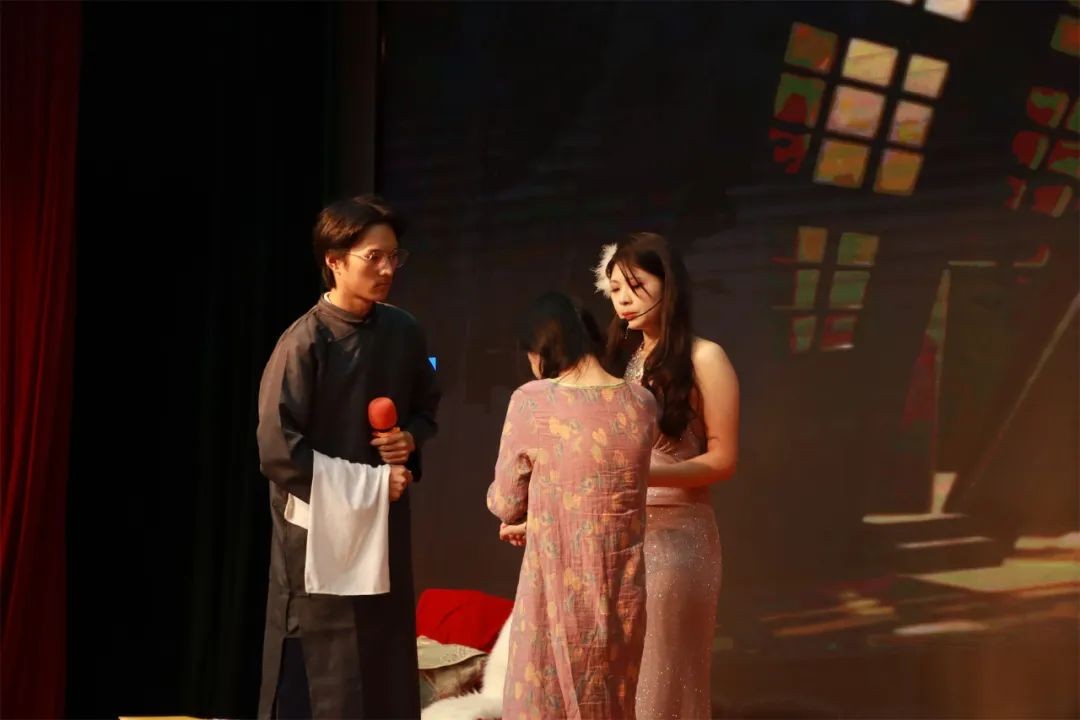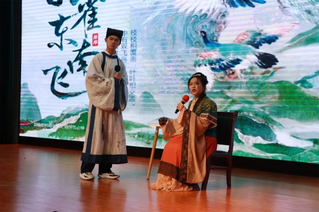 2316班同学带来的话剧《日出》则将晚会推向了一个新的高潮。通过细腻的表演和深沉的情感表达,引发观众对生命与人性的深刻思考。2408班、2409班同学表演了话剧《孔雀东南飞》,演员们用细腻的表演与生动的台词再现了这段千古爱情悲歌。经典文学的魅力通过他们的精彩演绎直抵观众内心,情感的跌宕起伏让人动容。2317班的相声《好坏学生》则以幽默风趣的表演将校园生活的趣事搬上舞台,两位同学的默契配合惹得现场笑声连连,掌声不断。