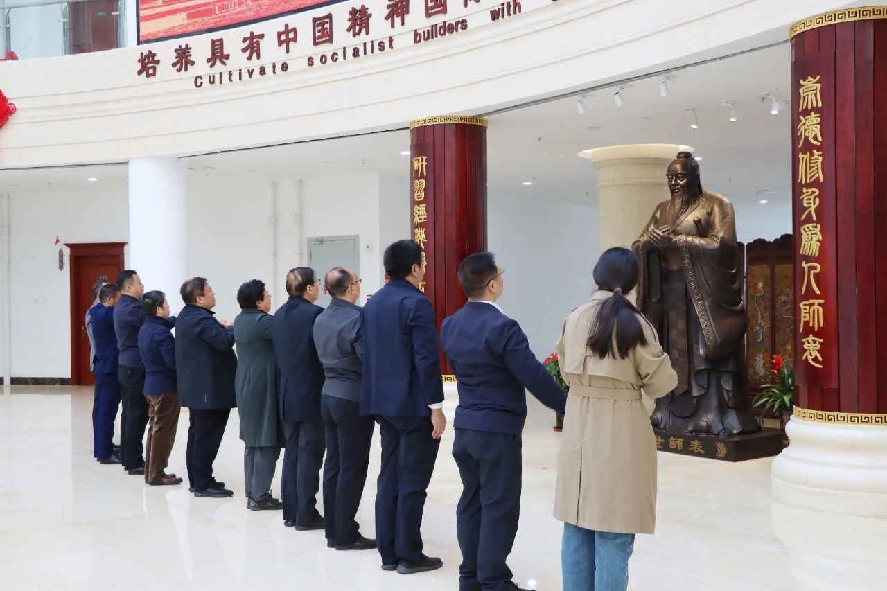 在图书综合楼内来访领导们参观了我校的孔子像,并举行了简短而庄重的拜孔子仪式。在仪式中采用了四拜礼,行礼时遵循双手紧贴、与胸同高的规范,在拜孔子的过程中念诵了张载的“横渠四句”:“为天地立心,为生民立命,为往圣继绝学,为万世开太平”,以此表达对孔子地位的崇高敬意和对其思想的传承。