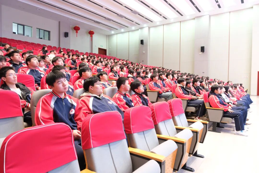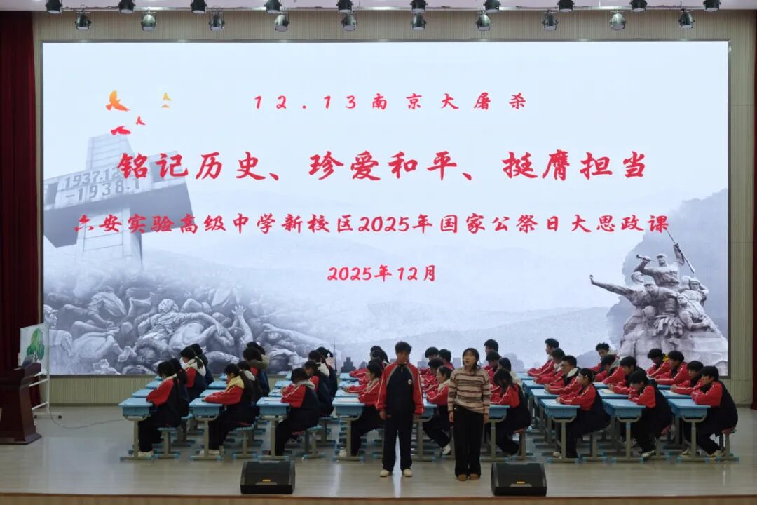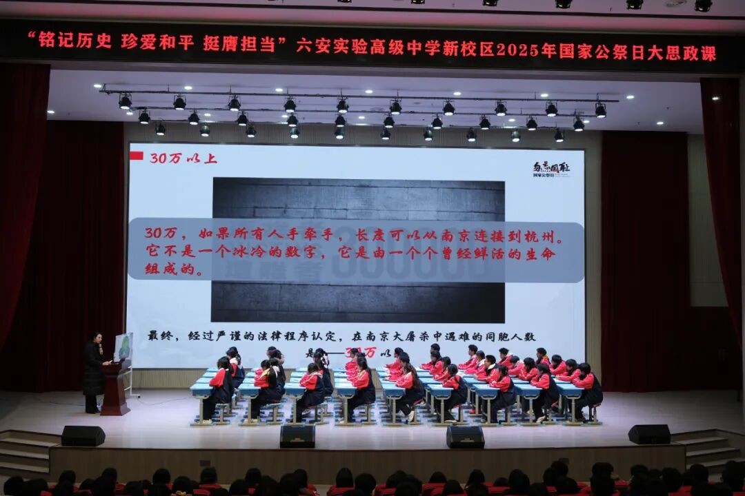 2025年12月13日是第12个南京大屠杀死难者国家公祭日,为深化爱国主义教育,创新思政育人形式,12月12日晚,一堂覆盖全校的沉浸式德育班会课在我校新校区报告厅成功举行。本次课程采用线上线下同步进行的模式,由安徽省青年讲师团成员、六安市青年宣讲员、我校团委书记潘生娓主讲,主会场设在报告厅,部分班级现场聆听,其余所有班级通过云视讯系统在教室同步观看。