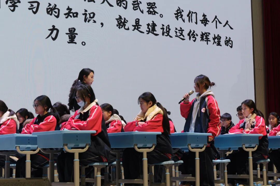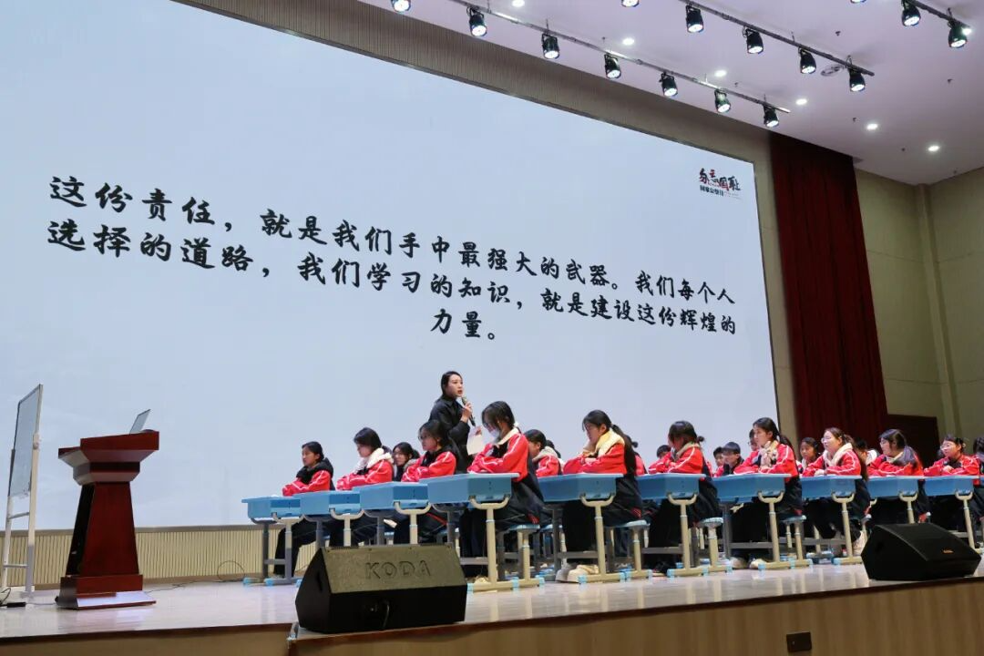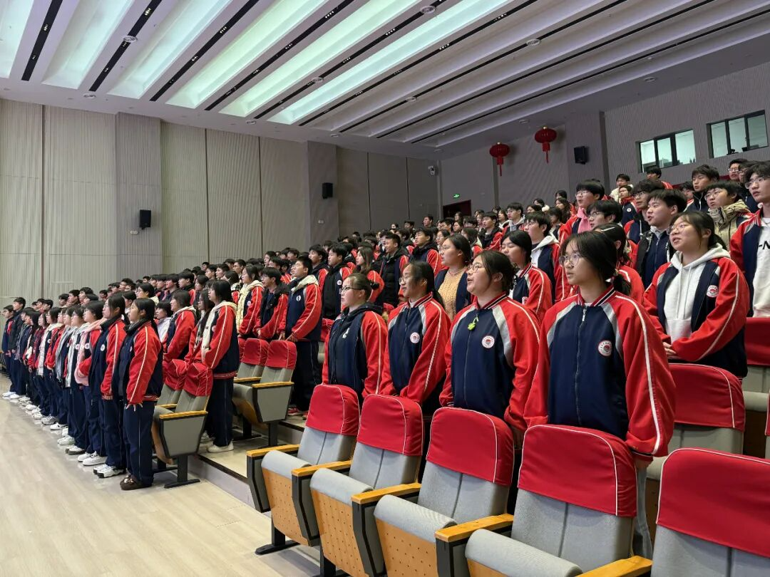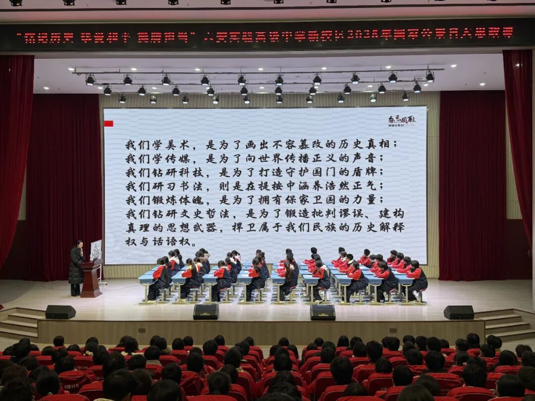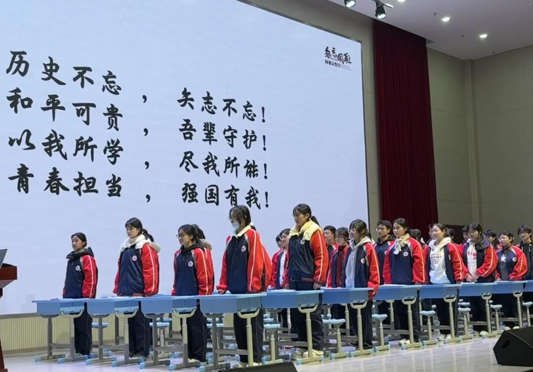课程最后,在潘老师的带领下,全体学生肃立,以青春之名庄严宣誓:“铭记历史,珍爱和平;以己所学,报效祖国;青春有为,挺膺担当;强国有我,请党放心!”铿锵誓言响彻礼堂,将课堂气氛推向最高潮,完成了从历史认知到情感共鸣,再到行动决心的完整教育闭环。