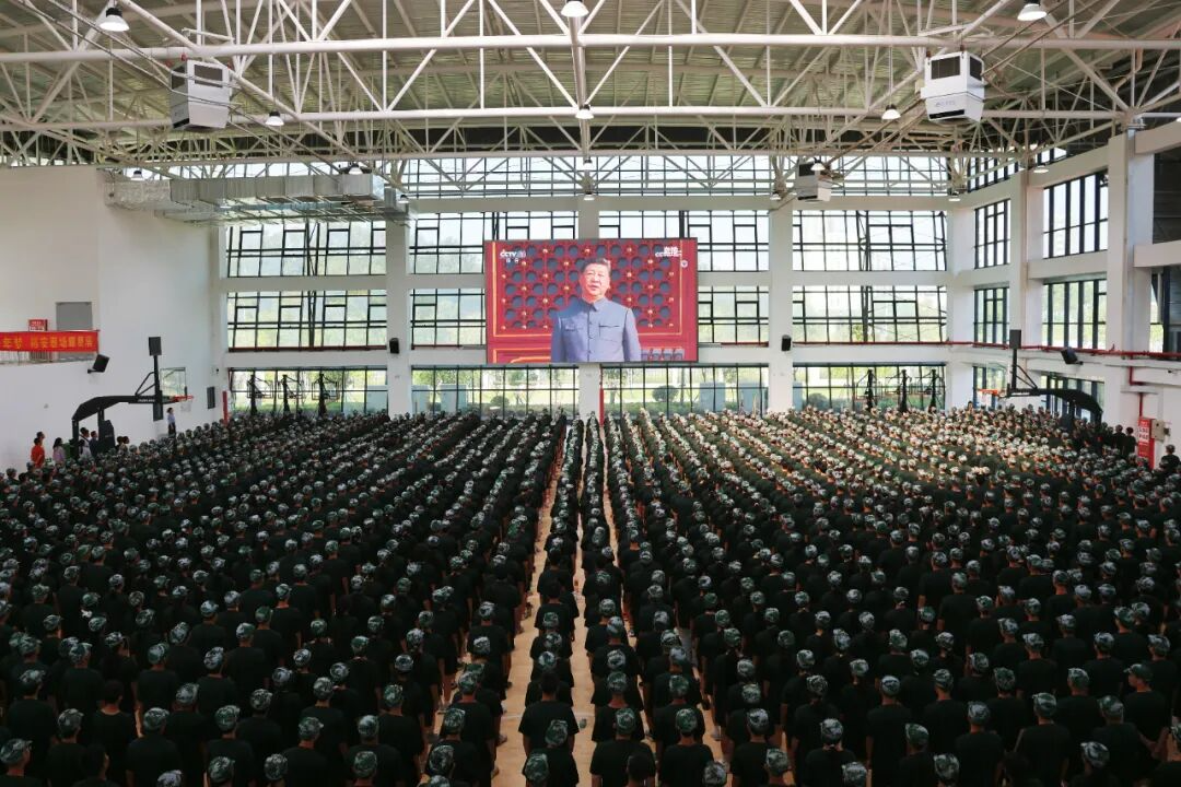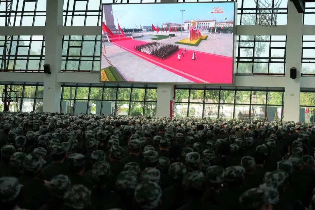 阅兵式开始,身着军训服的高一新生端坐体育馆内,目光聚焦屏幕上的盛大阅兵场面,心中涌动着澎湃的爱国情怀。屏幕上,受阅部队以严整的军容、高昂的士气,依次通过天安门广场接受检阅。空中梯队呼啸苍穹,地面装备威武前行,展示了我国国防和军队现代化建设的重大成就。整个阅兵过程历时约70分钟,展现了人民军队听党指挥、能打胜仗、作风优良的强军风貌。新型武器装备的亮相,彰显了国家科技创新能力和综合国力的提升,让观看的师生们倍感自豪。