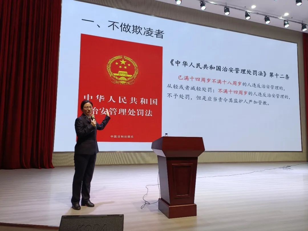 韩主任联系实际、以案释法,围绕防欺凌主题,对与未成年人犯罪的相关法律法规进行深入解读,并从校园欺凌的含义、危害、校园欺凌该如何处罚、如何预防等方面,结合真实的案例,用通俗易懂的语言和大家阐述了校园欺凌的应对办法。她提醒同学们首先不能做欺凌者,其次要提高自我保护意识,遇事要及时告诉家长和老师;平时要与老师、家长多沟通,勇于表达自己的看法;同时要保持乐观向上的态度,与同学们友好相处、互相帮助。她引导同学们要在面对校园欺凌、不法侵害时学会如何维护自己的合法权益,树立正确的人生观、价值观。