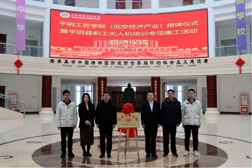12月24日,平阴工匠学院(低空经济产业)授牌仪式在山东深泉技师学院举行。县总工会党组成员、经审委主任汝凯,团县委副书记翟嫣然,县行政审批局副局长、低空经济专班副主任马文进,县农业局植保科科长尹逊堂,山东深泉技师学院校常务副校长辇玉杰等参加活动。